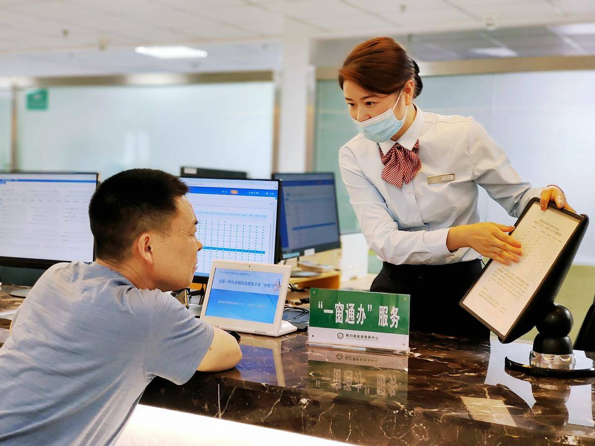 秭歸縣政務(wù)服務(wù)中心“一窗通辦”窗口工作人員為群眾介紹事項服務(wù)指南。(視界網(wǎng) 譚三要 攝)