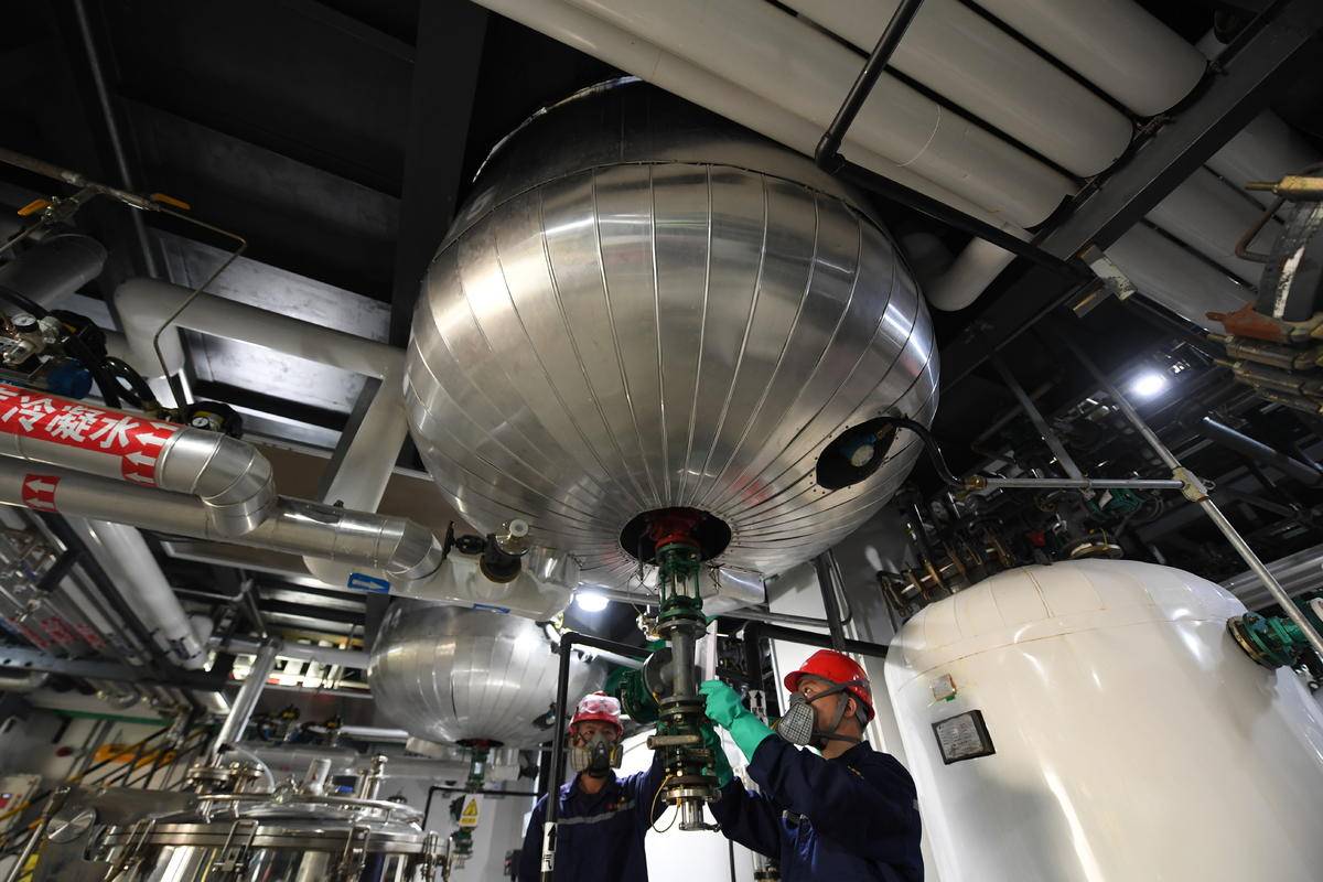 湖北天舒藥業(yè)有限公司(宜城)員工在檢查設(shè)備運(yùn)行情況。(湖北日報全媒記者田悅 通訊員李鋒、謝勇 攝)