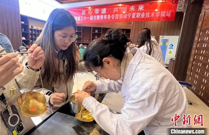 中新網銀川2月18日電 (楊迪 徐英凡)17日下午,參與全國臺聯第三十一屆臺胞青年冬令營寧夏分營的40余名臺胞走進寧夏職業技術學院,開啟一場非遺手工的沉浸式體驗之旅。