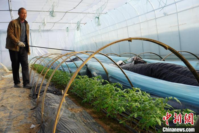 2月15日,河南鄭州,農民掀開番茄苗的保溫層,增加光照。中新社記者 韓章云 攝