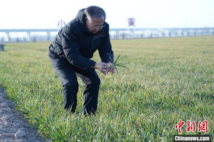 2月16日,河南新鄉,小麥育種專家茹振鋼察看小麥生長情況。中新社記者 闞力 攝