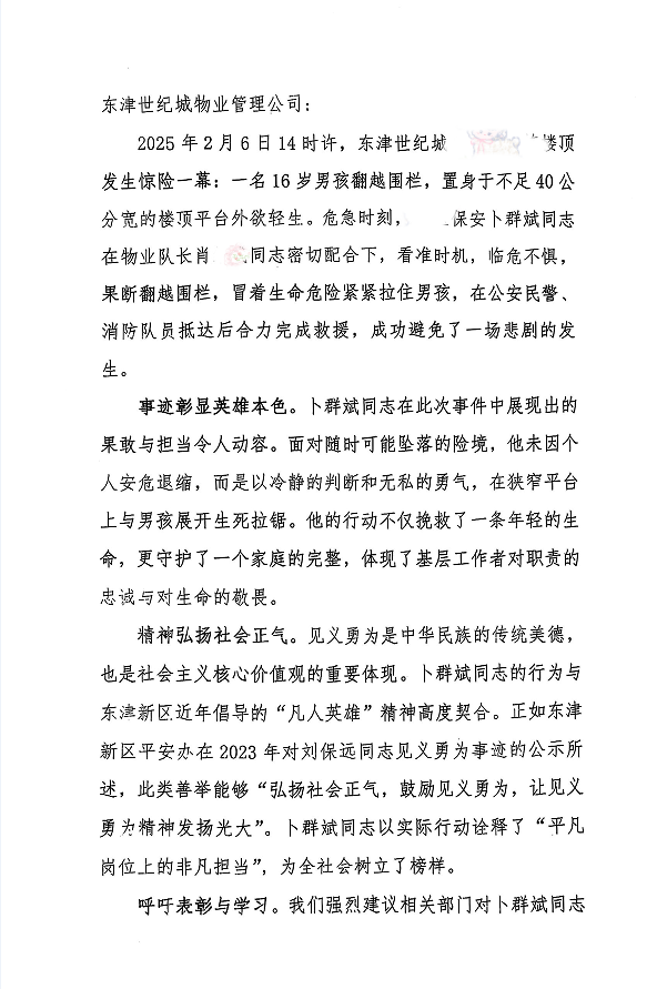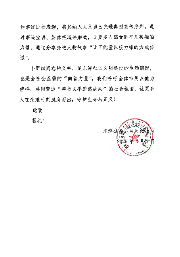 東津公安分局六兩河派出所也為民發(fā)物業(yè)公司送來了一封令人動容的感謝信。表彰卜群斌同志“以實際行動詮釋了‘平凡崗位上的非凡擔當’,為全社會樹立了榜樣。”,并呼吁全體市民以他為榜樣,共同營造“善行義舉蔚然成風”的社會氛圍,讓更多人在危難時刻挺身而出,守護生命與正義。