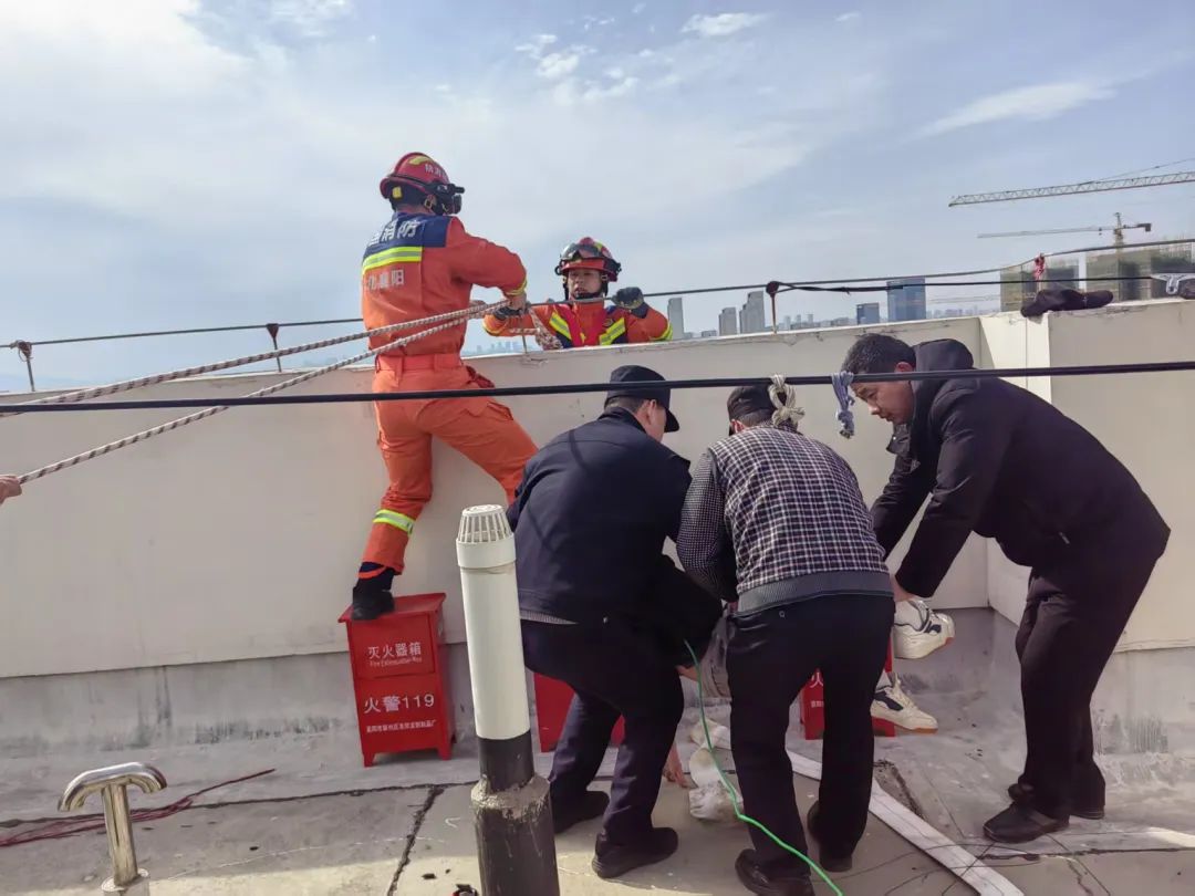 1點58分,派出所民警與消防救援人員抵達該小區(qū)事發(fā)樓棟,一隊人員在一樓地面處充起了安全氣墊床,另一隊迅速來到頂樓處裝備好安全救援繩,對輕生少年實施救援工作。