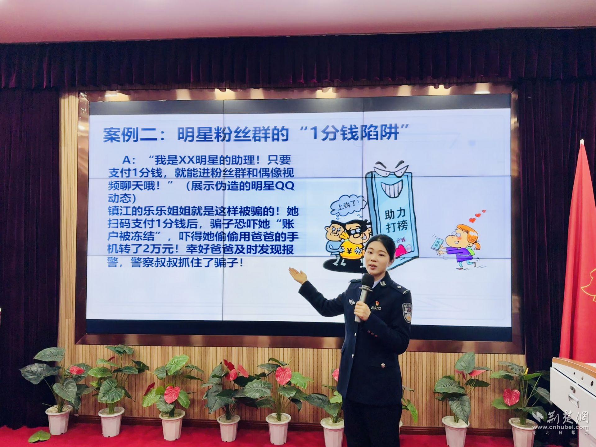 在防范電信網(wǎng)絡(luò)詐騙知識宣講環(huán)節(jié),野芷湖派出所民警李盼盼用生動的語言、活潑的授課方式、有趣的現(xiàn)場互動,結(jié)合網(wǎng)絡(luò)詐騙具體案件,對“游戲充值詐騙”“追星”和“冒充警察”三類高發(fā)、頻發(fā)的網(wǎng)絡(luò)詐騙形式進行講解,并通過情景模擬和互動問答,幫助學生識別詐騙套路,掌握防詐技能,同時鼓勵學生將反詐知識帶回家中,以“小手拉大手”的形式擴大宣傳覆蓋面。