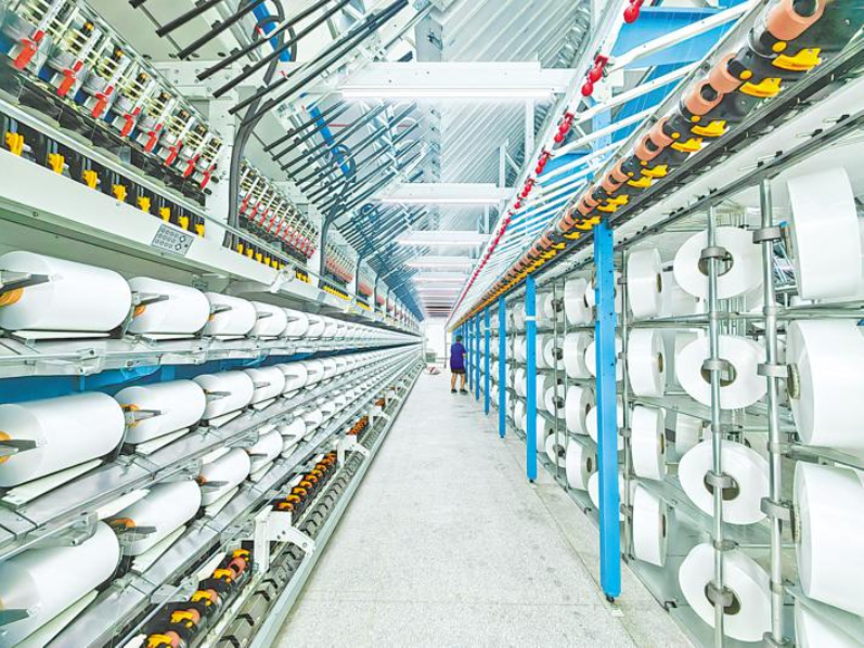 在三圓紡織生產(chǎn)線上,化纖原料經(jīng)加彈機(jī)定型,制成高性能滌綸絲。