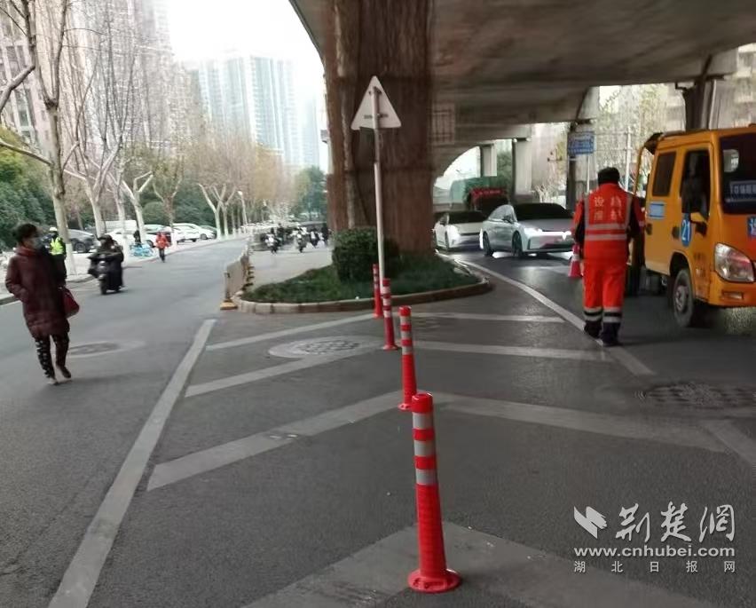江漢區姑嫂樹路興業路南側道路,機動車與非機動車混行,主道輔道機動車交織,容易引發交通事故。江漢區交通大隊多次實地踏勘,制定優化方案,通過安裝柔性隔離柱、增補護欄和警示燈,有效規范“橋下空間”通行軌跡,保障群眾通行安全。