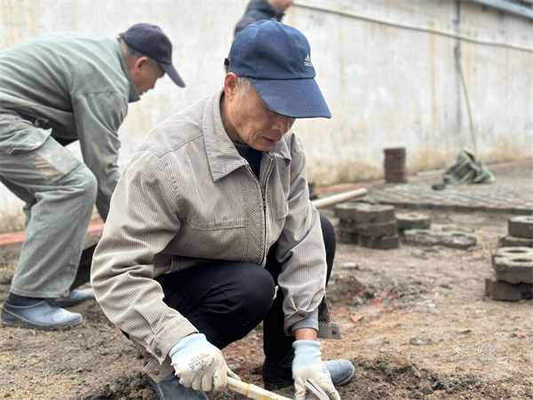 吳天和鋪設(shè)停車位地磚。 通訊員供圖