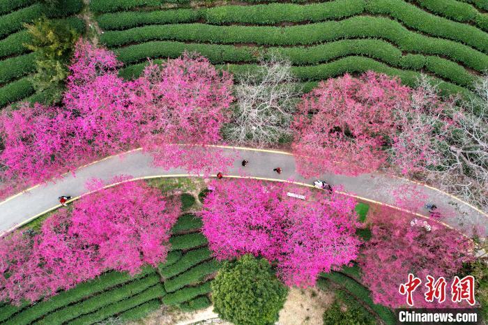 2月19日,在謝東慶創(chuàng)辦的臺品櫻花茶園內(nèi),櫻花競相綻放。(無人機(jī)照片)中新社記者 張金川 攝
