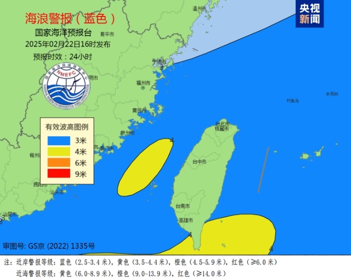 受冷空氣的影響,預(yù)計2月23日白天,東海南部、釣魚島附近海域、臺灣海峽、臺灣以東洋面將出現(xiàn)3到4.5米的大浪到巨浪區(qū);福建近岸海域?qū)⒊霈F(xiàn)2到3米的中浪到大浪,近岸海域海浪預(yù)警級別為藍(lán)色。請在上述海域作業(yè)的船只注意安全,沿海各有關(guān)單位提前采取防浪避浪措施。