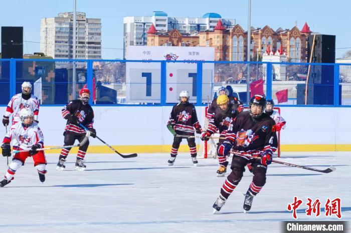 2月22日,中俄界江黑龍江國(guó)際冰球友誼賽在冰封的黑龍江江面上舉行,圖為兒童組比賽現(xiàn)場(chǎng)?!⊥趿?攝