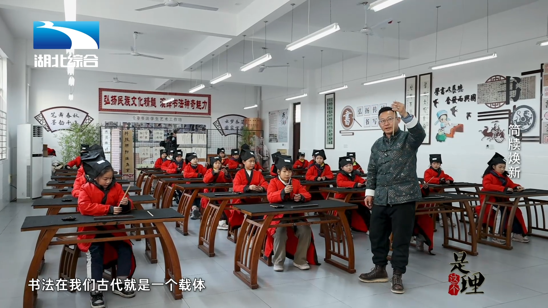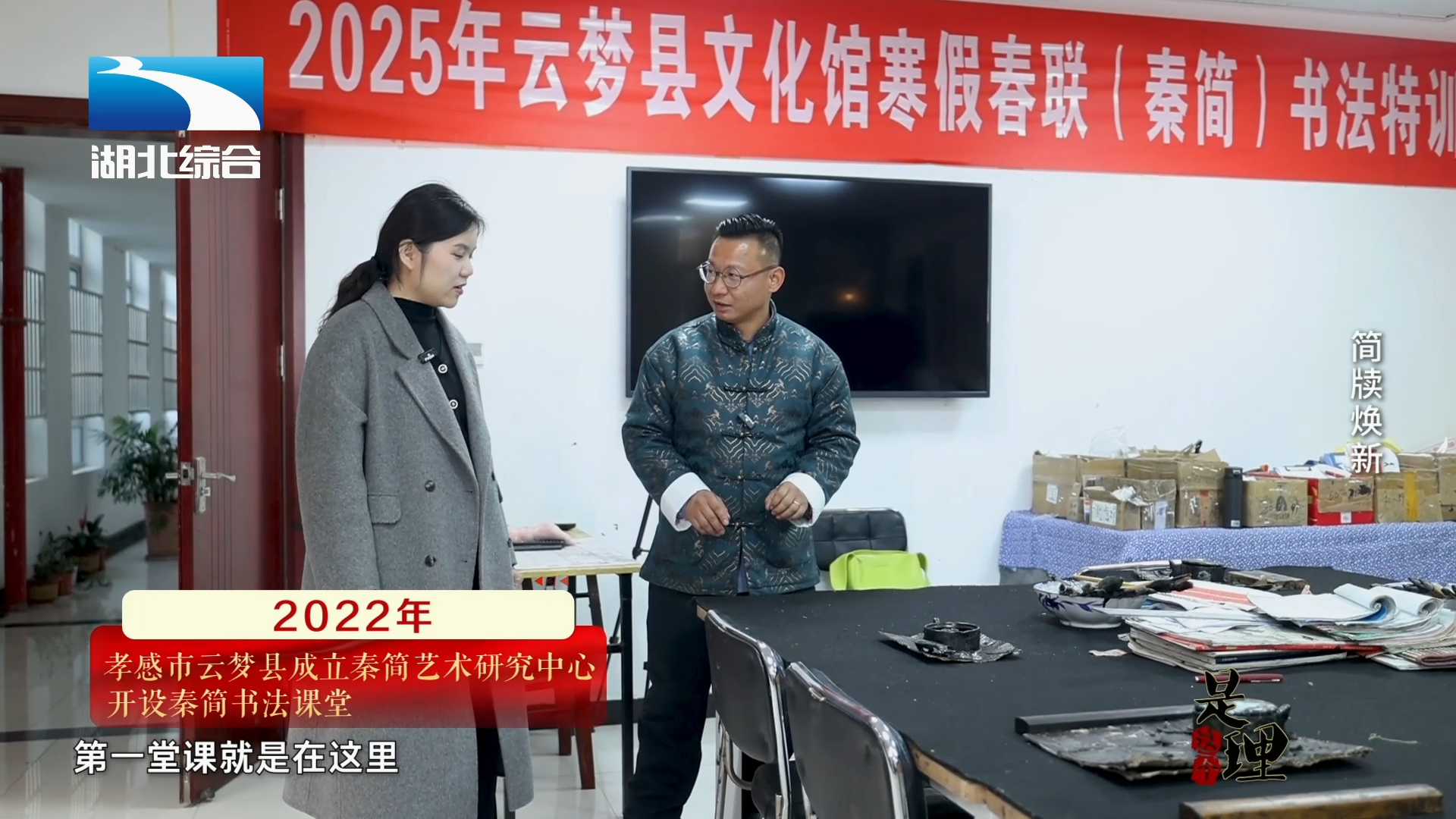 在孝感市云夢縣黃香小學,一場關于睡虎地秦簡的書法文化課堂正在進行。“有沒有哪位同學知道,睡虎地秦簡的墓主人叫什么?”孝感市云夢縣文化館書法教師李文濤向學生們介紹著睡虎地古墓主人和秦簡書體古隸。李文濤表示,書法在古代是記錄歷史的載體,他希望通過書法這一媒介,讓更多人了解云夢和睡虎地秦簡,并將這一文化傳承下去。