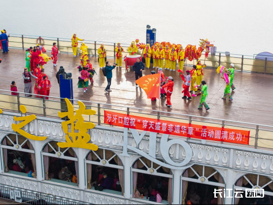 這次活動堪稱一場民俗雅集。熱鬧非凡的舞龍舞獅表演,彰顯著傳統民俗的蓬勃活力。剪紙服飾秀《非遺遇上穿天節》驚艷眾人,模特身著用剪紙元素制作的精美服飾,每一步都似一幅流動的剪紙畫。最后,眾人手拉手圍在一起,歡快地唱起了《喊彩歌》,歌聲中飽含著對生活的熱愛和對傳統文化的傳承。游客陳女士站在甲板上感嘆道:“在這江面上聽著傳說,看著表演,感覺真的穿越到了古代,觸摸到襄陽文化的根。”