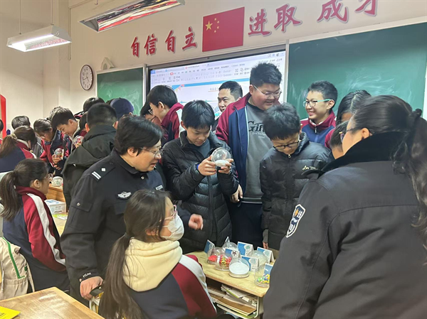 積玉橋派出所張警官則通過真實(shí)案例剖析,將晦澀的法律條文轉(zhuǎn)化為生活場(chǎng)景。現(xiàn)場(chǎng)設(shè)置的毒品模型展示區(qū),學(xué)生們緊盯細(xì)節(jié)特征,自發(fā)記錄辨別要點(diǎn),爭(zhēng)相通過氣味、包裝等細(xì)節(jié)辨識(shí)仿真毒品模型。