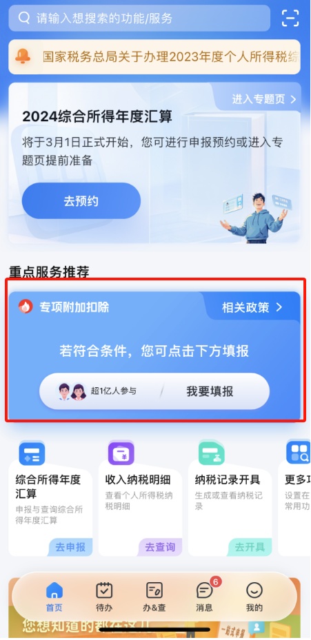 第一步,打開個稅App,在首頁專項附加扣除處點擊“我要填報”。