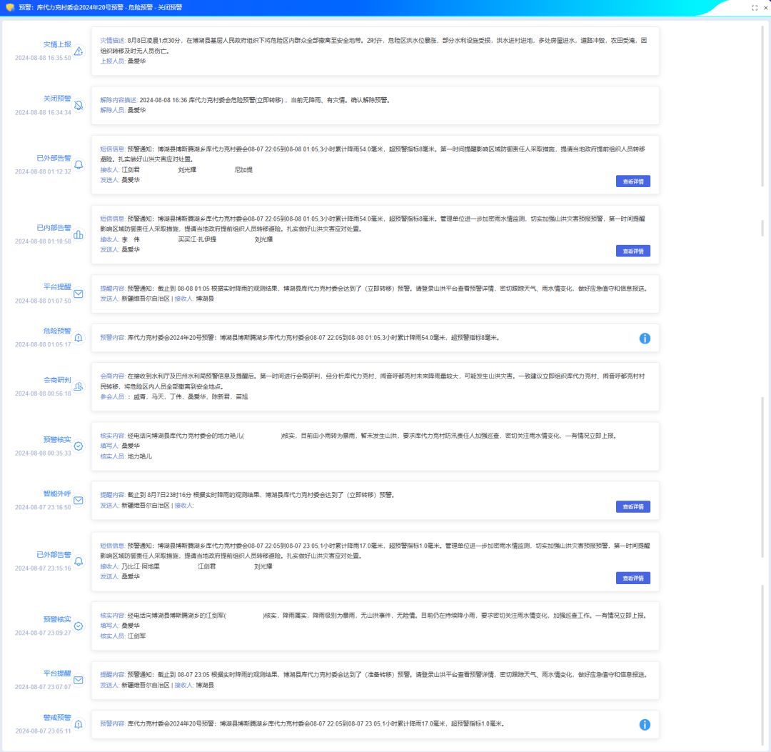一是基于未來24小時降雨預報發(fā)布風險預警。8月7日18時,新疆維吾爾自治區(qū)水利廳聯(lián)合氣象局發(fā)布未來24小時山洪災害氣象風險預警,其中巴州博湖縣為橙色預警;18時35分,博湖縣水利局向縣、鄉(xiāng)、村三級防汛責任人“點對點”發(fā)送預警信息93條。18時50分,網(wǎng)格長、包戶干部通過電話、微信工作群等方式提醒村民做好隨時轉移準備。