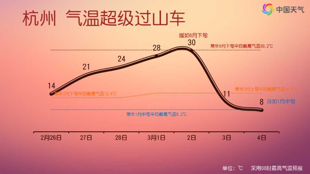 南方的暖熱程度將比北方更為明顯,預計要到3月1日至2日氣溫才會陸續達到近期高點。城市中,合肥、武漢、南京、上海、杭州、長沙、南昌、重慶、貴陽未來3、4天氣溫將屢創新高。其中,杭州、南昌、長沙、福州3月2日最高氣溫將升至30℃上下,初夏感撲面而來!