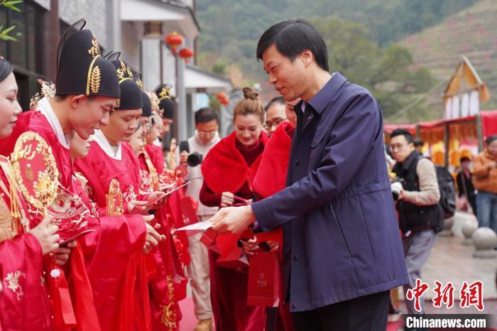 2月27日,永春桃花季古風(fēng)姻緣會系列活動啟動。圖為10對新人現(xiàn)場領(lǐng)取結(jié)婚證書。 林藝穎 攝