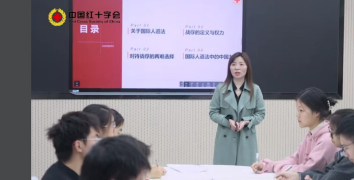 2024年11月,為深入貫徹落實習近平同志致信中國紅十字會十二大精神和關于紅十字事業重要指示批示精神,沙市區紅十字會將拍攝制作《人道法》課件的重棒交給胡淑瓊。接到任務后,她克服時間緊、任務重、要求高等諸多困難,利用不到一周的時間完成了備課、擬定課堂問答、制作PPT、協調拍攝場地等任務,圓滿完成了《基于國際人道法——對待戰俘的兩難選擇》的課件拍攝。在30多分鐘的授課中,胡淑瓊從探索人道法的視野,結合人道主義事業、紅十字國際組織、紅十字精神及職能等進行了立體式、沉浸式講授,還與大學生們進行了討論、提問和互動。