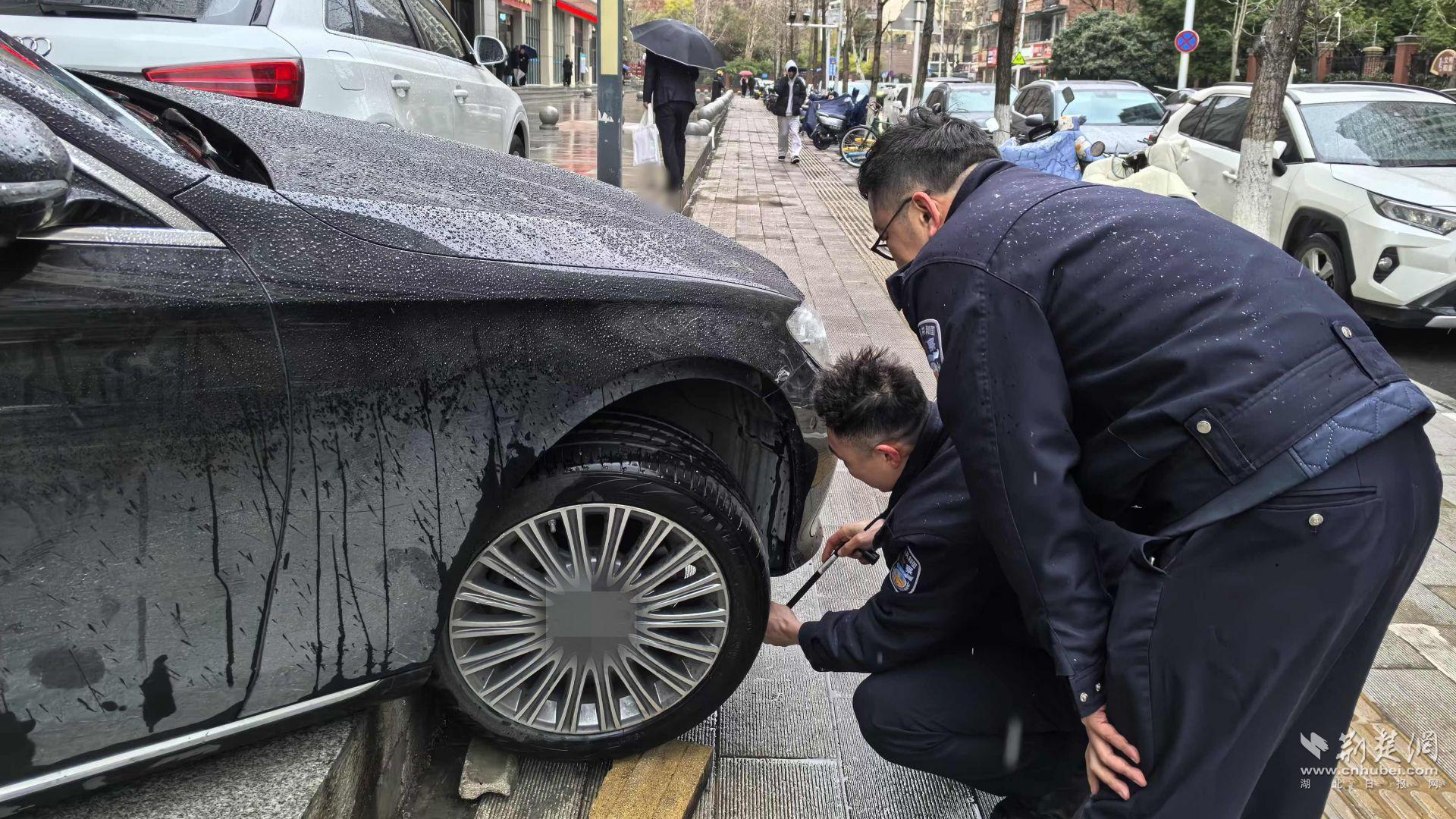 作為曾在部隊服役多年的退伍汽車兵,輔警曾維檢查現場情況后,發現轎車系底盤卡住導致無法行動。憑借經驗,曾維就地取材找來廢棄的人行道地磚,配合車載小型千斤頂冒雨展開救援。