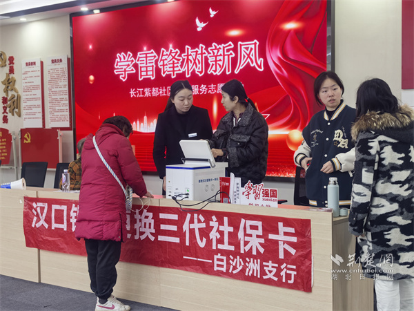 而在學習小站的另一處,青年志愿者們也在積極忙碌著。他們組成的志愿服務隊正在為老年居民辦理社??ǜ鼡Q業務?!澳催@里,點擊人臉識別后把證件平放在掃描區?!敝驹刚邆兡托牡貫槔夏昃用窠獯痍P于社??ǜ鼡Q的各種疑問,詳細講解社??ㄊ褂米⒁馐马?,引導他們完成一系列的辦理流程。他們用熱情和專業的服務傳遞溫暖,踐行雷鋒精神。