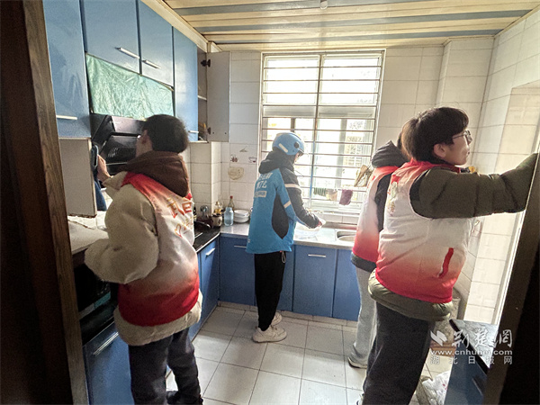 由騎手、大學生和轄區(qū)“五心”志愿者組成的志愿小組到獨居老人趙爺爺家做衛(wèi)生。 通訊員供圖