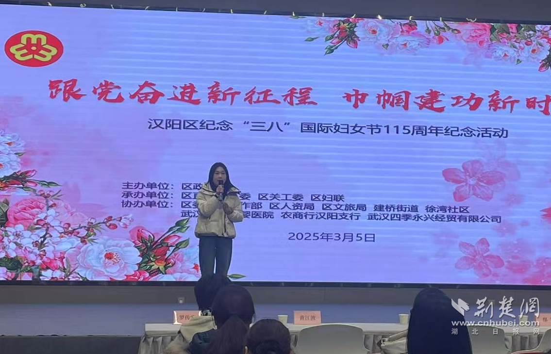 活動期間,武漢康健婦嬰醫院院長劉照娟、漢陽區法院家事審判庭法官劉莊員分別進行主題演講,充分展現新時代女性的風采與擔當。剛剛榮獲“全國巾幗文明崗”榮譽稱號的武漢博宏建設集團有限公司綜合辦公室“崗花們”,以精彩的情景劇演繹了“巾幗建新功”的動人篇章。