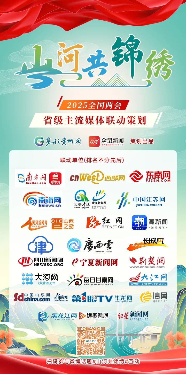 2025全國兩會召開之際,從3月3日開始,多彩貴州網聯合南方網、西部網、東南網、南海網、中國江蘇網、青海新聞網、黃河新聞網、紅網、潮新聞、津云、廣西云、長城網、四川新聞網、寧夏新聞網、荊楚網、大河網、每日甘肅網、大江網、中國山東網、第一眼TV-華龍網、黑龍江網、信網、紅星新聞網共同推出“山河共錦繡”網絡主題宣傳活動。我們將沿著習近平總書記的足跡,穿越山河綿延,展現中國式現代化建設進程中物質文明和精神文明和諧發展的錦繡畫卷。