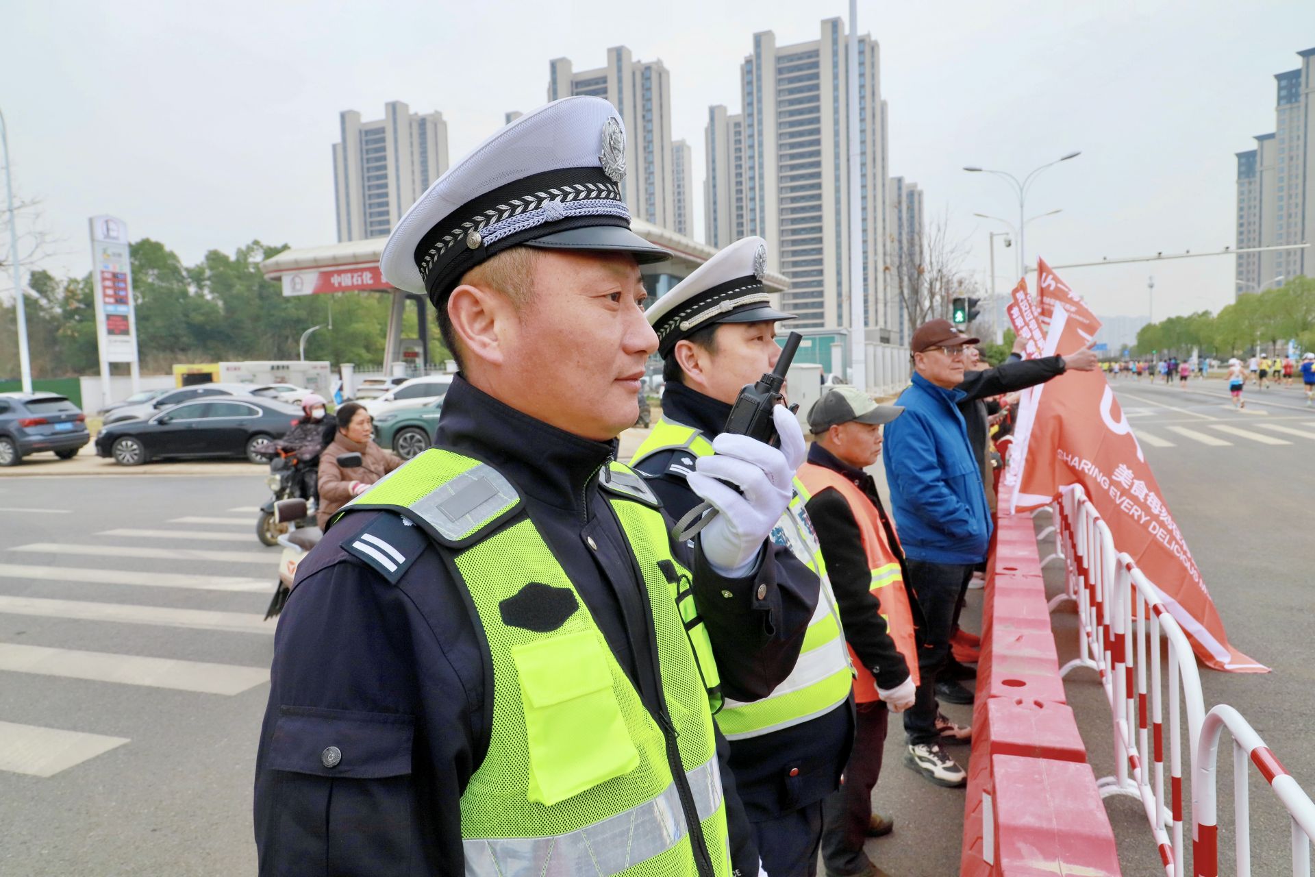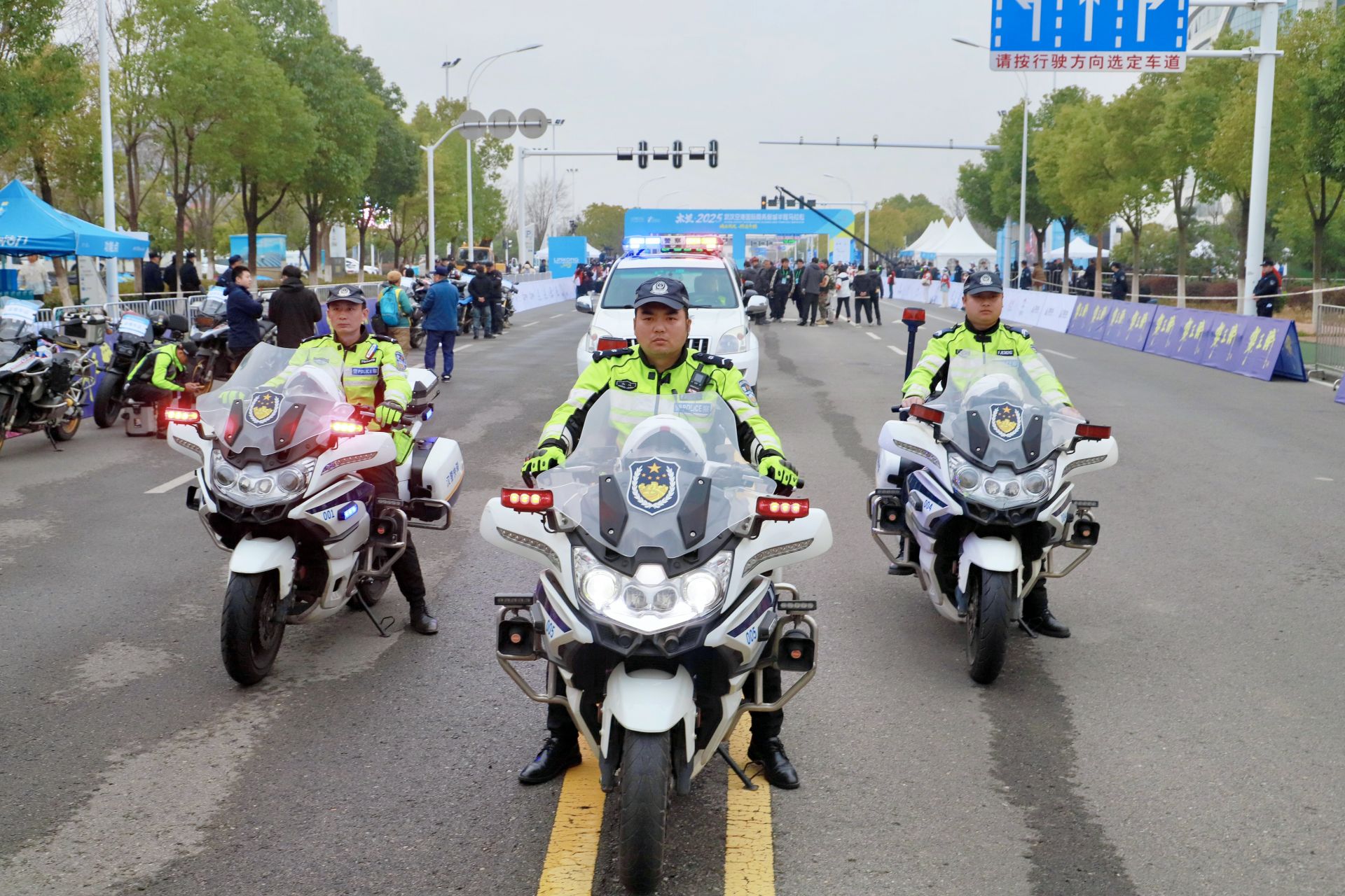 賽道上,黃陂公安交通大隊的3名騎警英姿颯爽,為選手們開道護航;賽道兩側(cè),全體安保警力跨立站崗,藏藍色的執(zhí)勤服與熒光色反光背心交相輝映,默默為選手加油鼓勁。