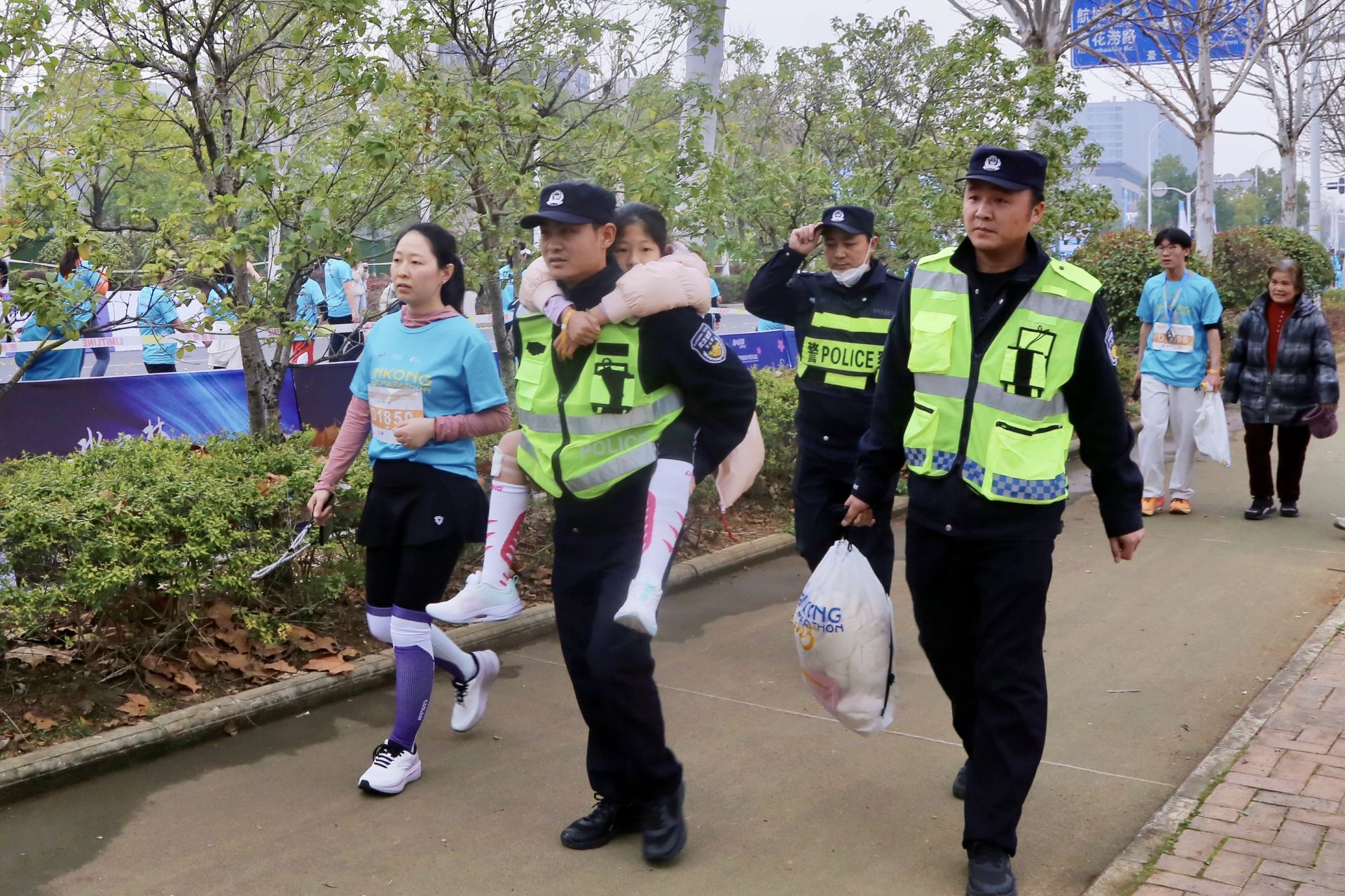 “您好,可以幫我聯(lián)系一輛救護車嗎?”8時40分許,法制大隊民警李超及輔警吳洋、王吉彪在執(zhí)勤時,遇到一位焦急的母親江女士求助。原來,江女士8歲的女兒晶晶在參加健康跑時不慎摔倒,膝蓋受傷,疼痛難忍。李超迅速聯(lián)系120救護車,并協(xié)助醫(yī)護人員為晶晶進行傷口處理。考慮到晶晶行動不便,李超主動提出背她前往停車區(qū)。由于停車區(qū)距離較遠,李超和吳洋、王吉彪輪流背起晶晶,徒步近一公里,最終將母女倆安全護送至車輛旁。臨別時,江女士連連道謝:“太感謝你們了,要不是你們幫忙,我真不知道該怎么辦!”