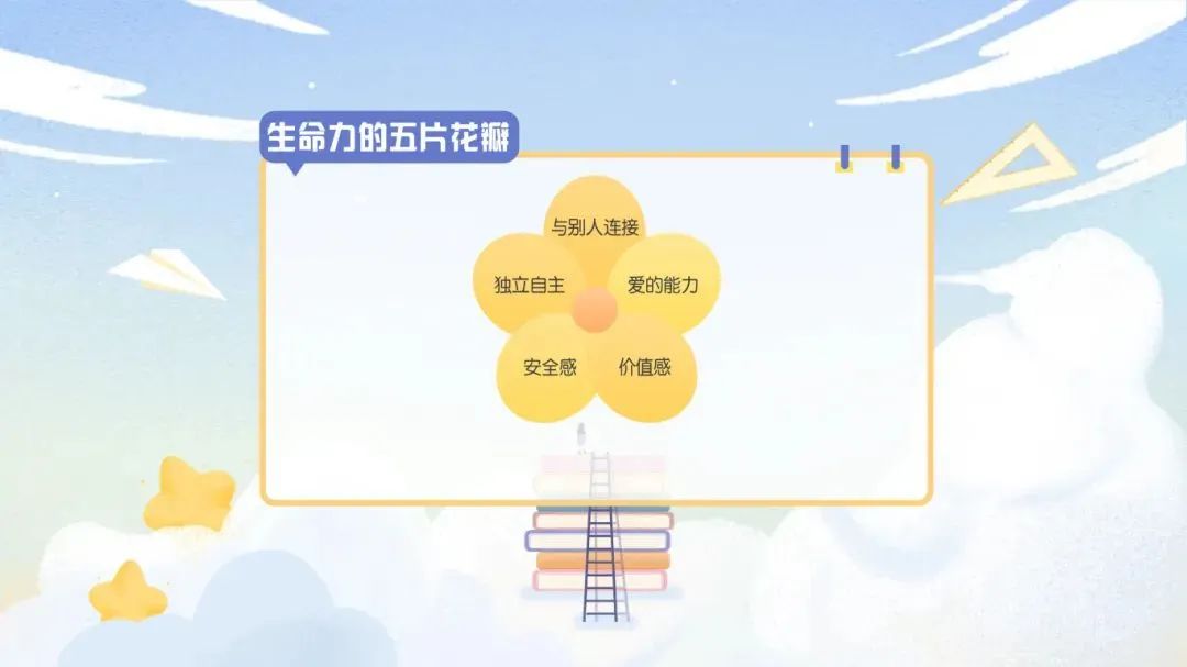 就像身體需要營養,心理也需要營養。愛的能力、與別人的鏈接、價值感、獨立自主和安全感,這五類心理營養組成了一朵“生命之花”,滋養著孩子成長。當孩子缺乏心理營養時,易出現情緒不穩定、人際關系問題和行為過激的狀況。