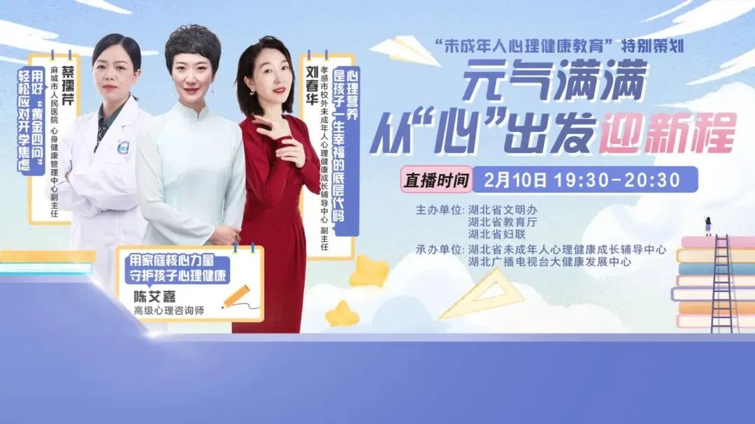 由湖北省文明辦、湖北省教育廳、湖北省婦聯、湖北省未成年人心理健康成長輔導中心聯合湖北廣播電視臺共同開展的未成年人心理健康教育直播活動,邀請到了三位湖北省未成年人心理健康輔導專家庫入庫專家,幫助孩子元氣滿滿進入新學期。
