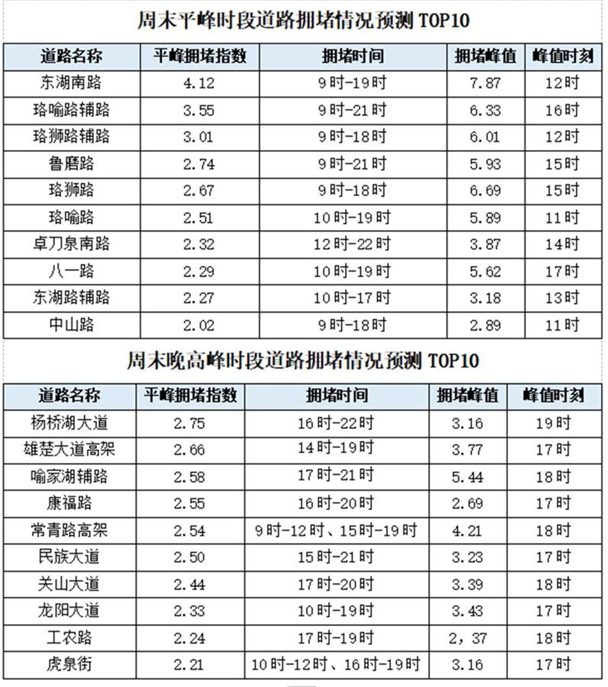 預計本周末擁堵排名靠前的道路如下:平峰時段擁堵道路主要集中在東湖風景區、武漢大學周邊,晚高峰時段受考試散場及游客回程疊加影響,擁堵道路除東湖、武大周邊之外,主要集中在城市主干道及部分學校周邊。
