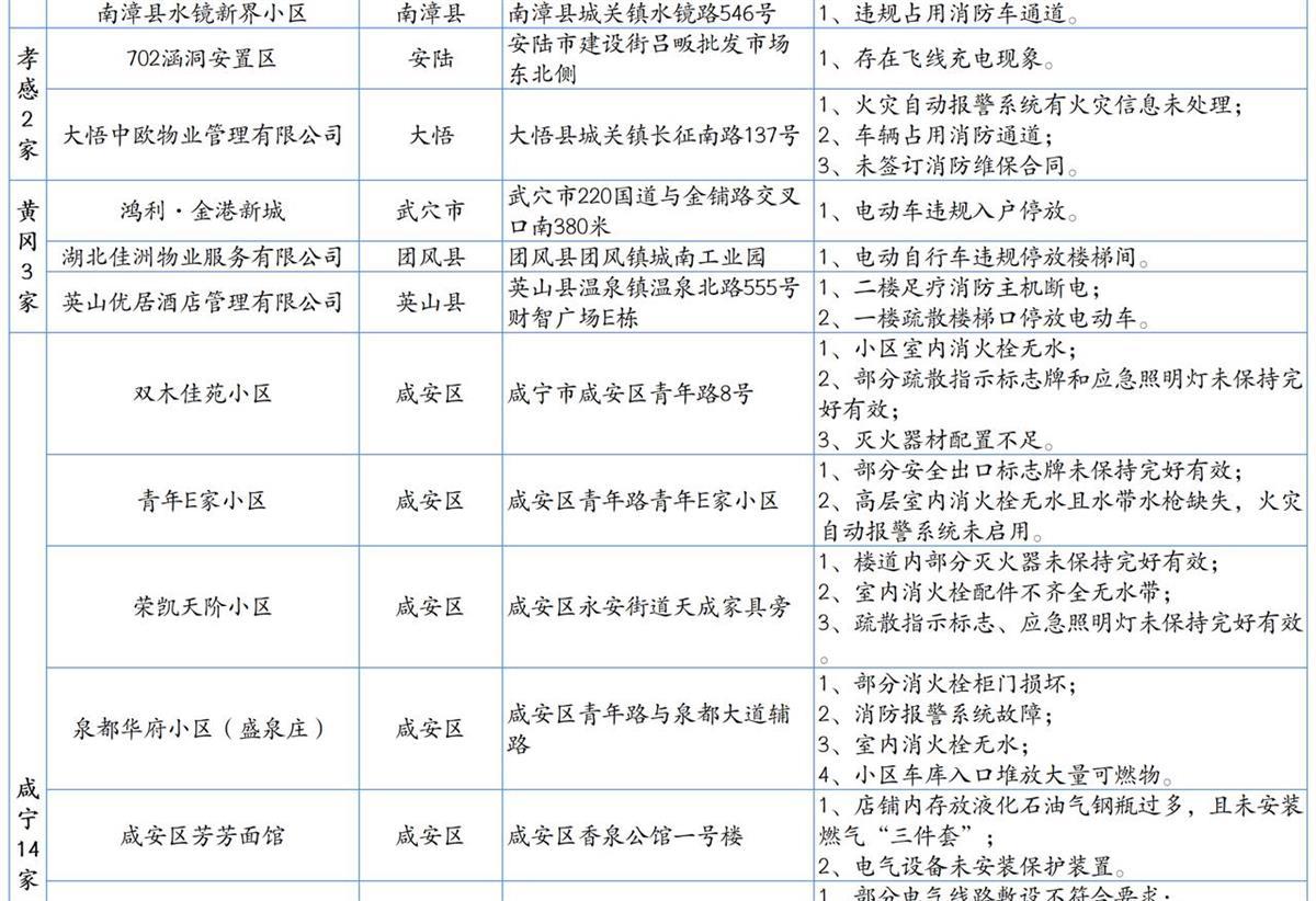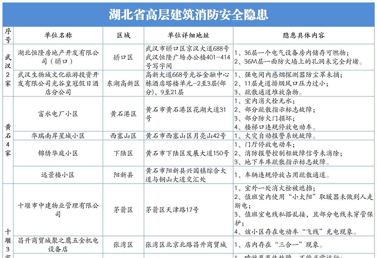 3月14日,湖北省消防救援總隊(duì)深入開(kāi)展消防安全隱患排查與曝光行動(dòng),公開(kāi)曝光高層建筑消防安全隱患單位48家,其中35家為小區(qū)、物業(yè)。