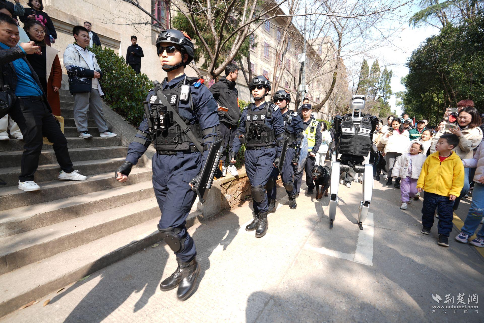 “哇!是春晚上的機(jī)器人嗎?”“警察叔叔,這個(gè)機(jī)器人可以做什么呢?”櫻花大道上,十余名學(xué)生好奇地將“智警小珞”團(tuán)團(tuán)圍住?!翱梢约骖櫲粘Q策壓驼Z音宣傳工作?!泵鎸μ釂枺窬榻B,“智警小珞”具備360°全景深度感知功能,可自主實(shí)現(xiàn)巡航、奔跑、跳躍、智能識別等功能。今年賞櫻季,武昌公安首次運(yùn)用“武裝警力+機(jī)器人+無人機(jī)”的“空地一體化”巡邏模式。