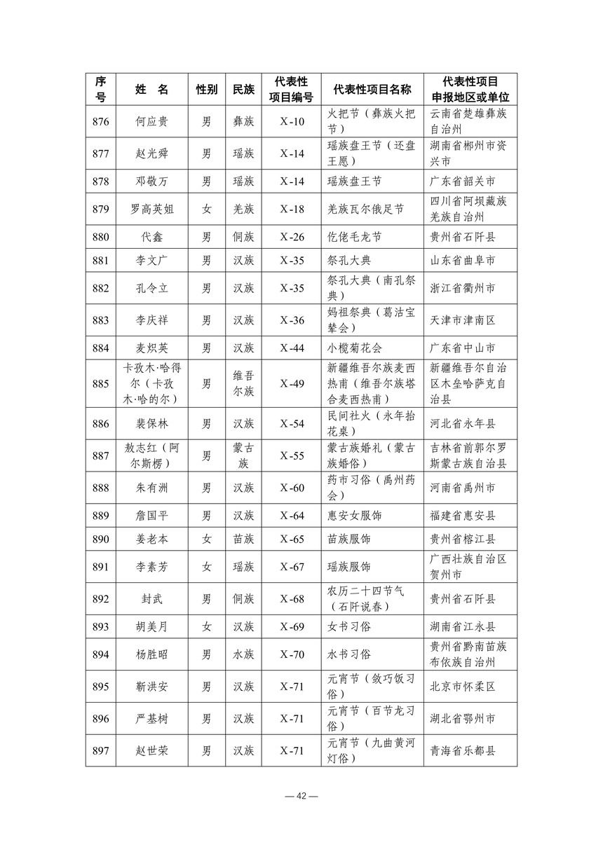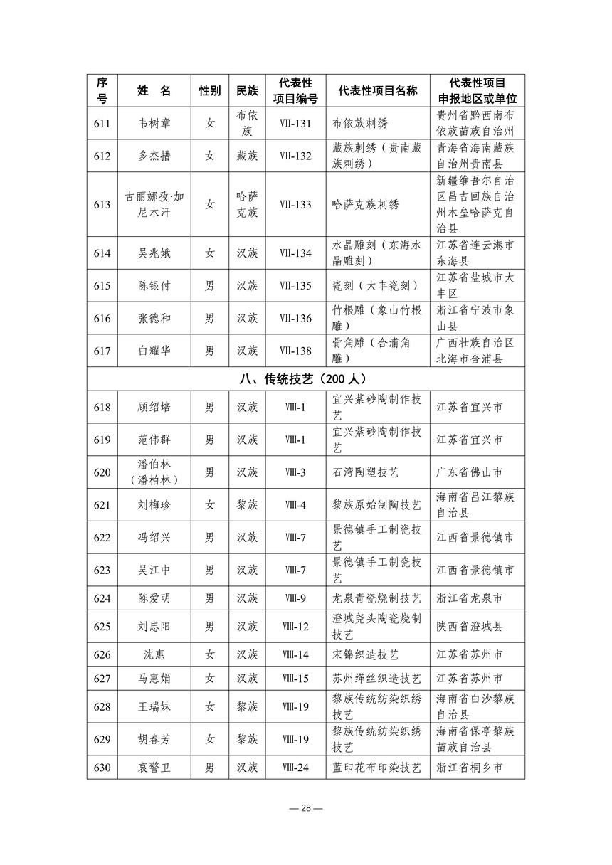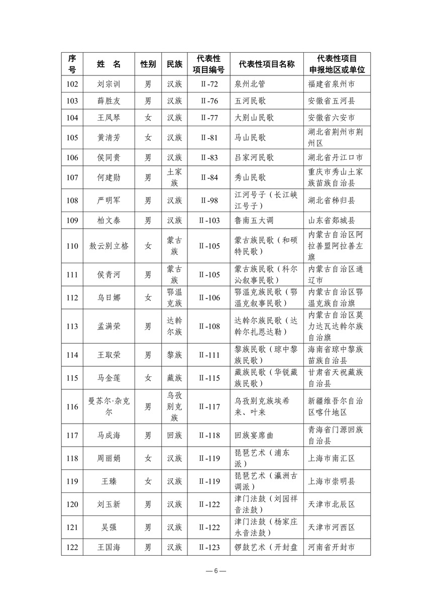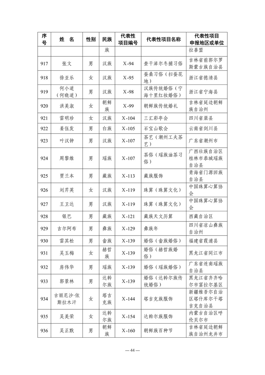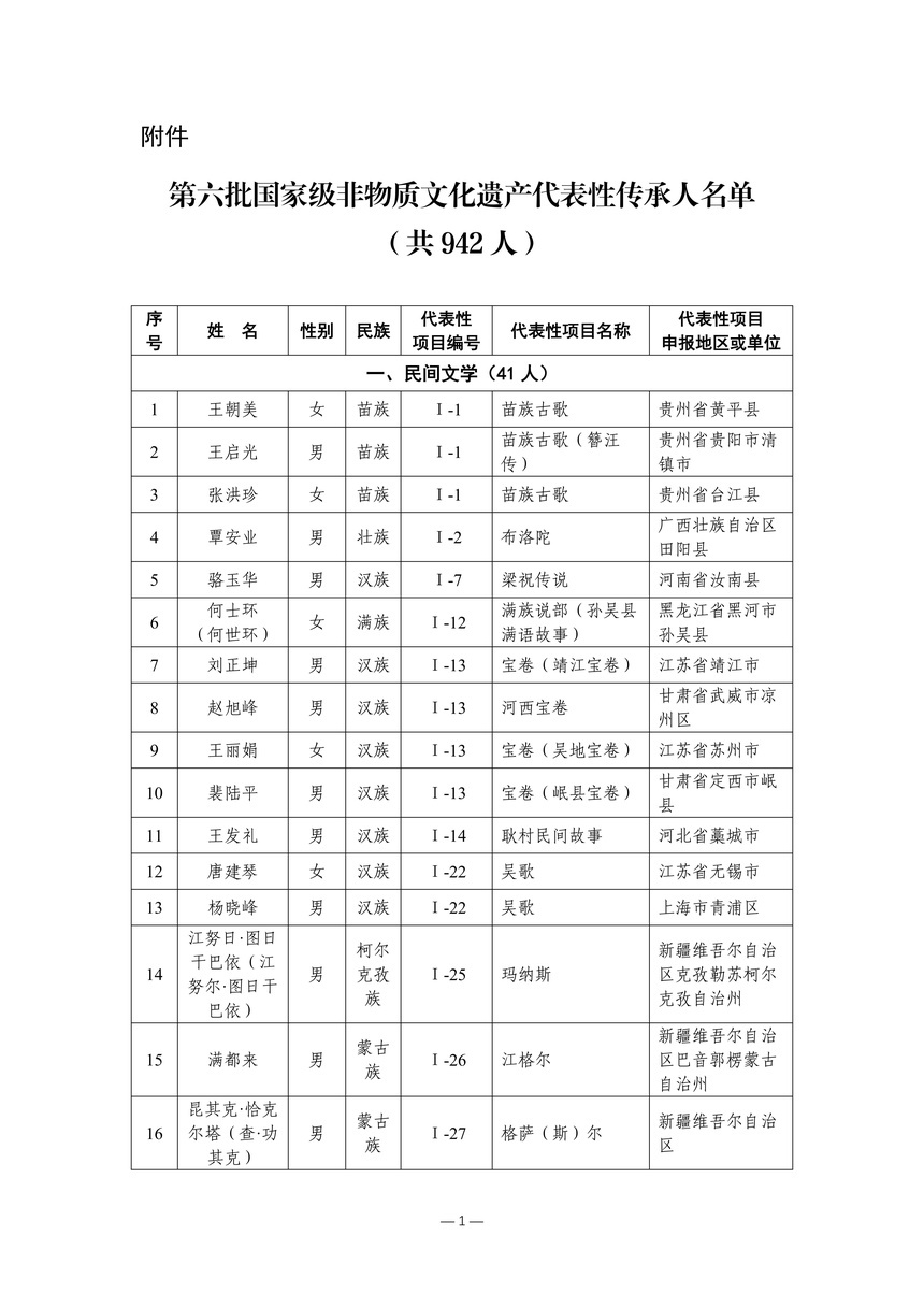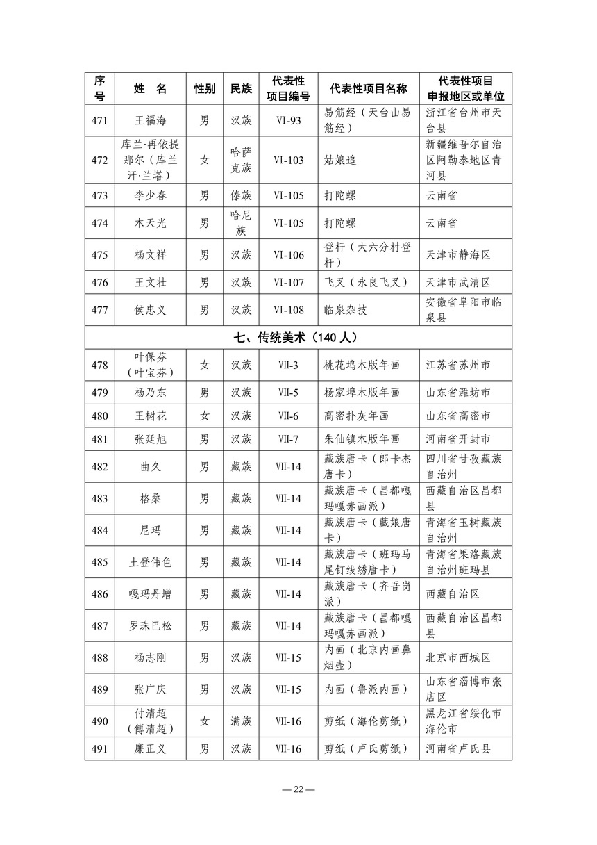 習近平總書記高度重視非物質文化遺產保護傳承,強調要積極培養傳承人,一代一代接下來、傳下去。近年來,各地高度重視非物質文化遺產代表性傳承人隊伍建設,涌現出一大批德藝雙馨、技藝精湛,在非物質文化遺產保護傳承中發揮重要作用的典型代表。根據《中華人民共和國非物質文化遺產法》及《國家級非物質文化遺產代表性傳承人認定與管理辦法》有關規定,為加強非物質文化遺產傳承人隊伍建設,進一步提升非物質文化遺產系統性保護能力水平,保護和傳承好非物質文化遺產,文化和旅游部組織開展第六批國家級非物質文化遺產代表性傳承人認定工作。經推薦申報、材料復核、專家初評、社會公示、評審委員會審議等程序,確定了第六批國家級非物質文化遺產代表性傳承人名單(942人),現予以公布。