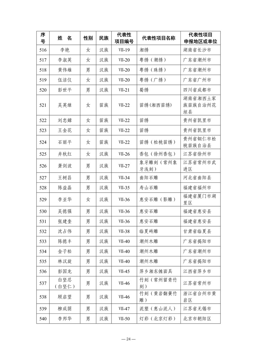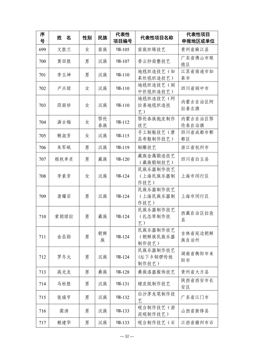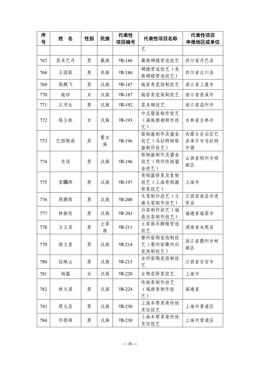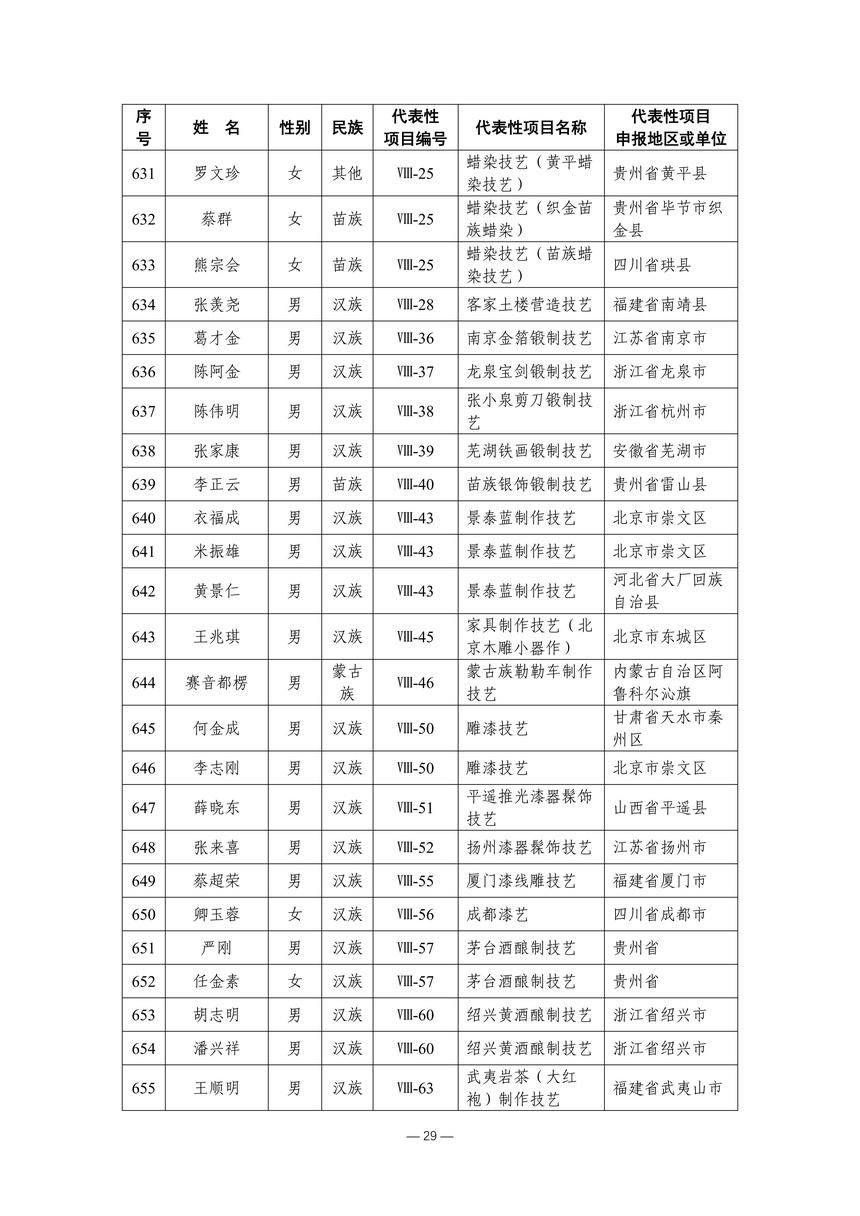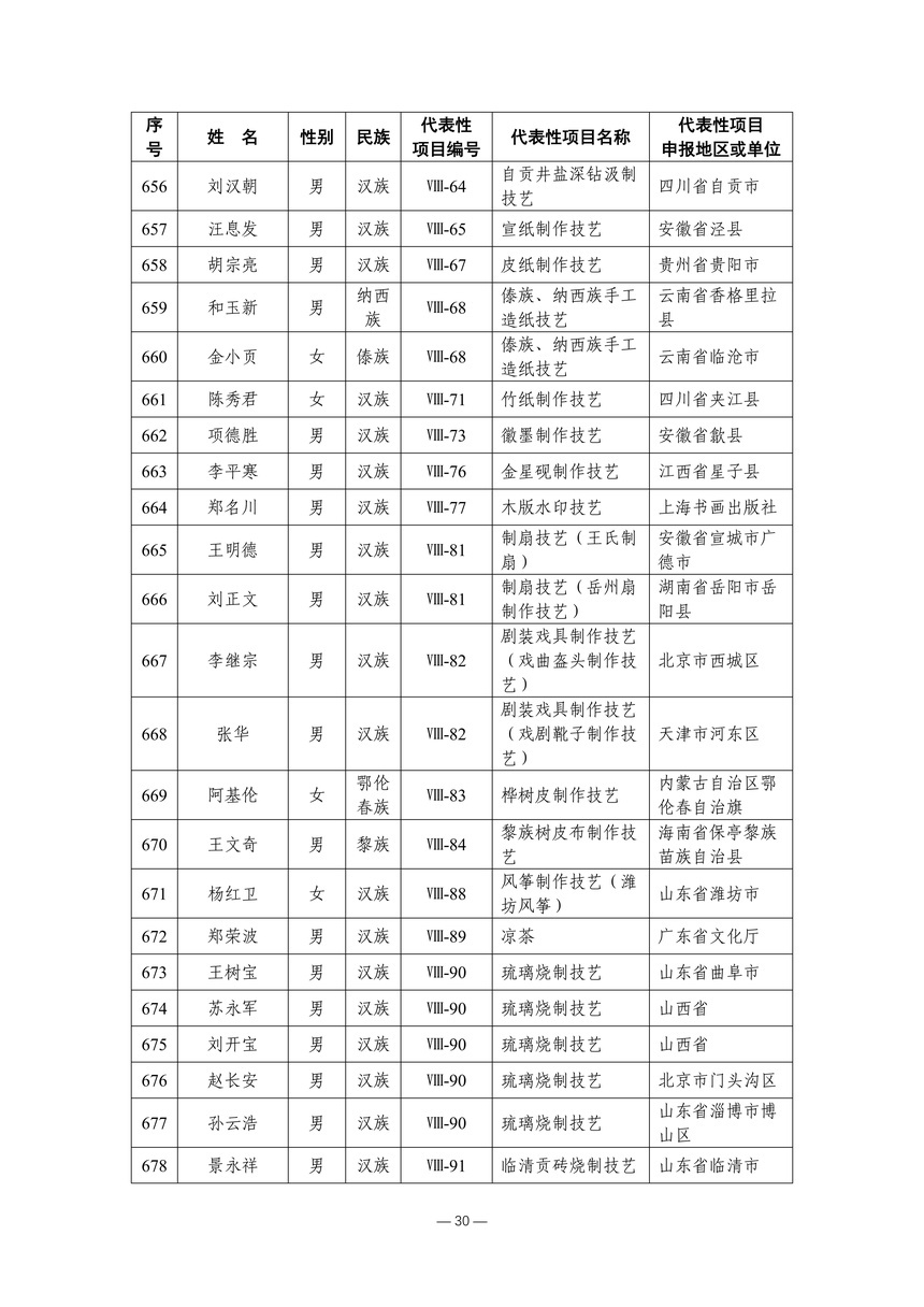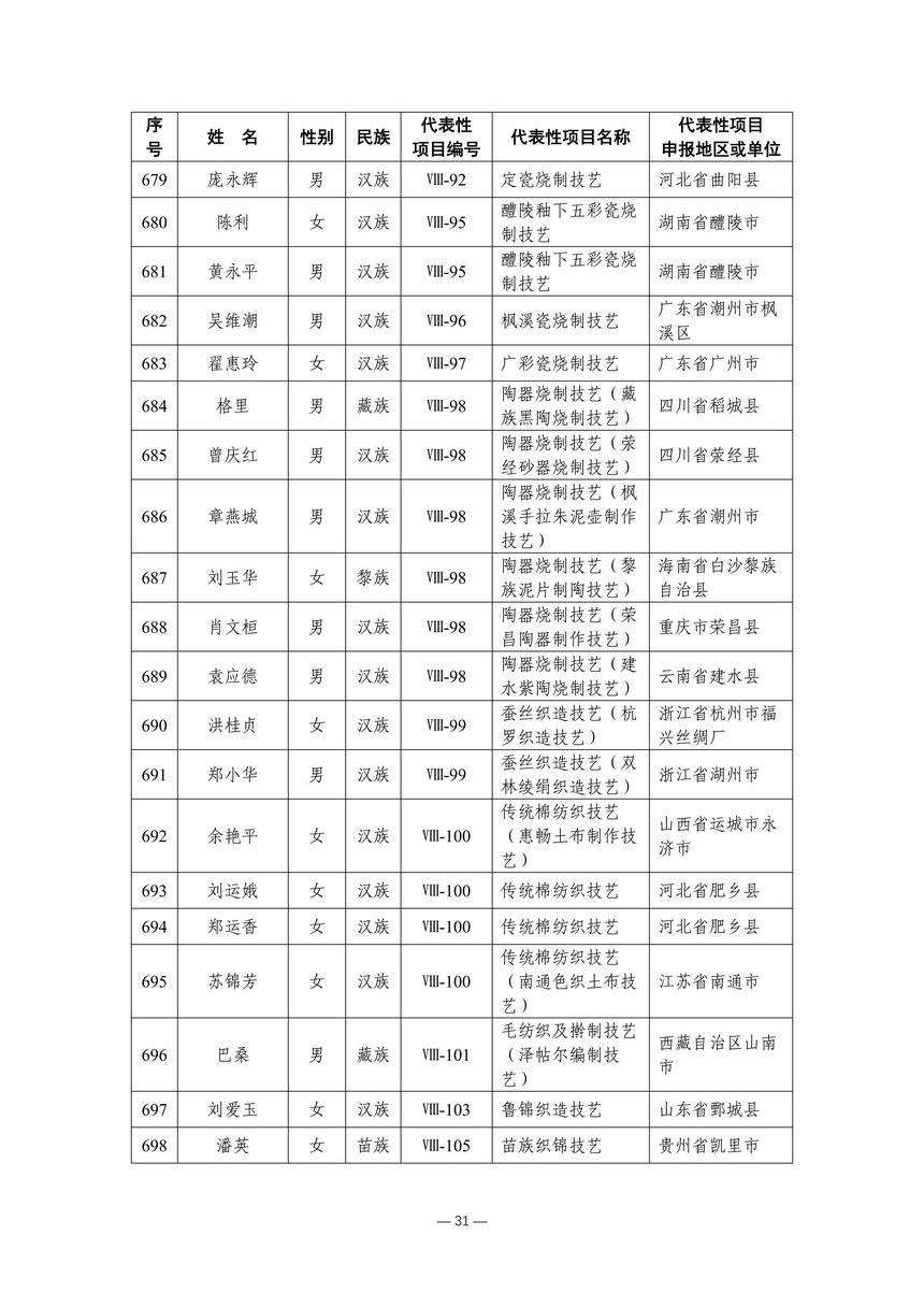 習近平總書記高度重視非物質文化遺產保護傳承,強調要積極培養傳承人,一代一代接下來、傳下去。近年來,各地高度重視非物質文化遺產代表性傳承人隊伍建設,涌現出一大批德藝雙馨、技藝精湛,在非物質文化遺產保護傳承中發揮重要作用的典型代表。根據《中華人民共和國非物質文化遺產法》及《國家級非物質文化遺產代表性傳承人認定與管理辦法》有關規定,為加強非物質文化遺產傳承人隊伍建設,進一步提升非物質文化遺產系統性保護能力水平,保護和傳承好非物質文化遺產,文化和旅游部組織開展第六批國家級非物質文化遺產代表性傳承人認定工作。經推薦申報、材料復核、專家初評、社會公示、評審委員會審議等程序,確定了第六批國家級非物質文化遺產代表性傳承人名單(942人),現予以公布。
