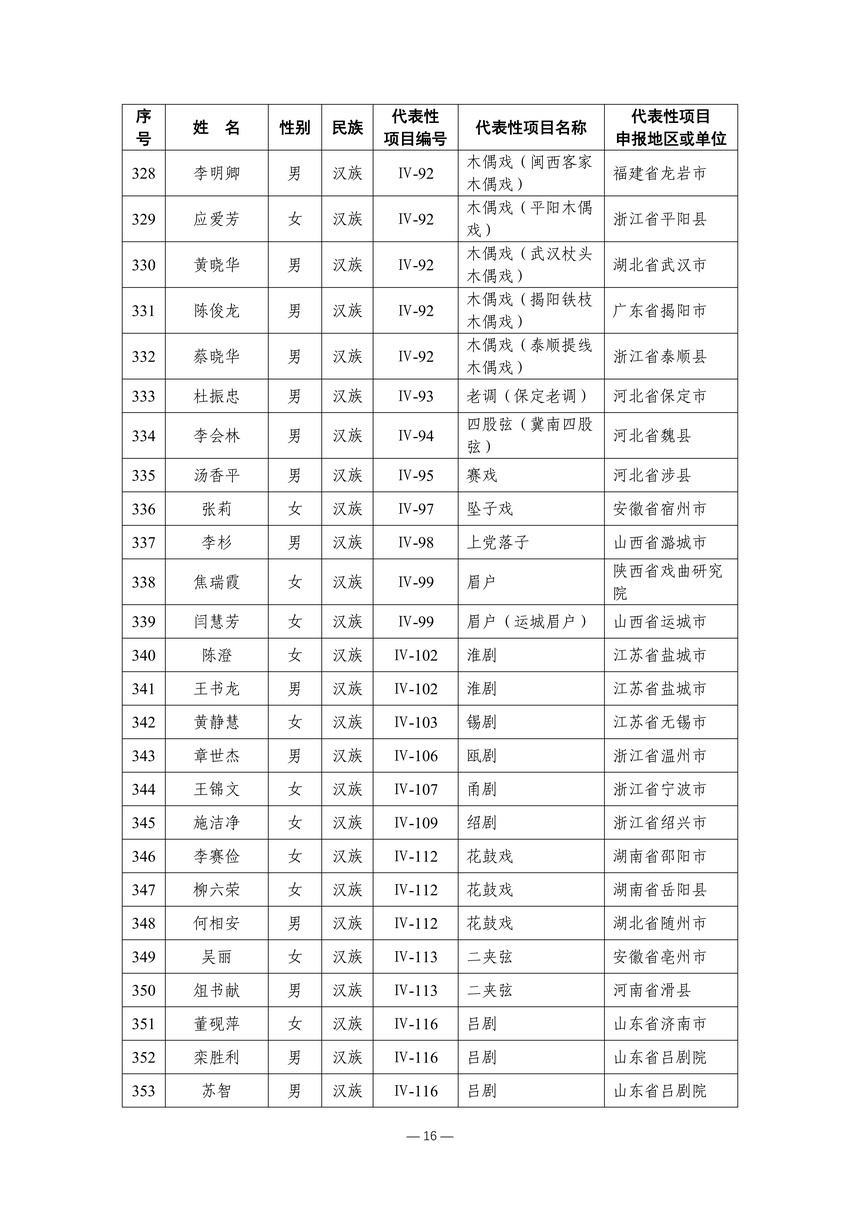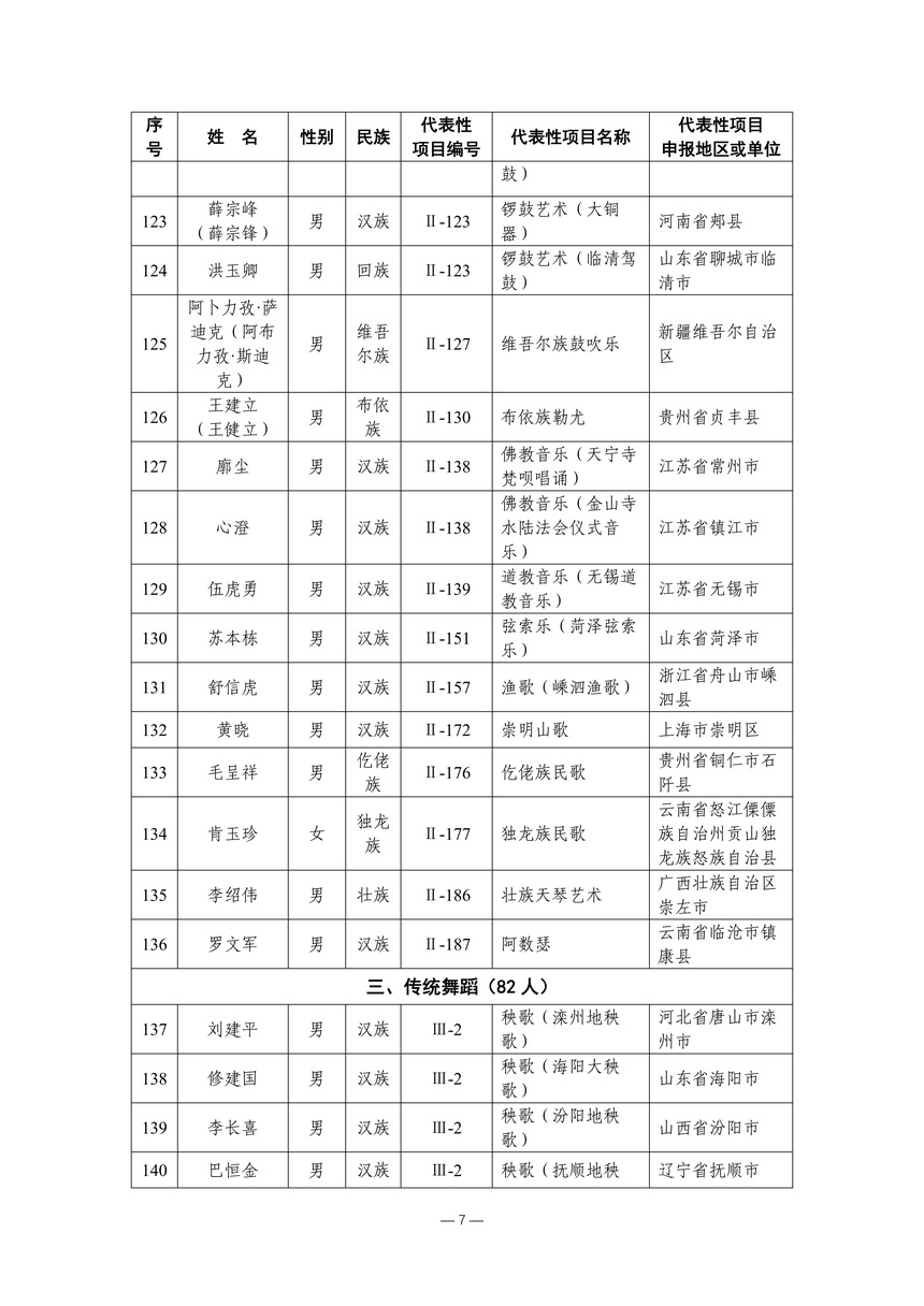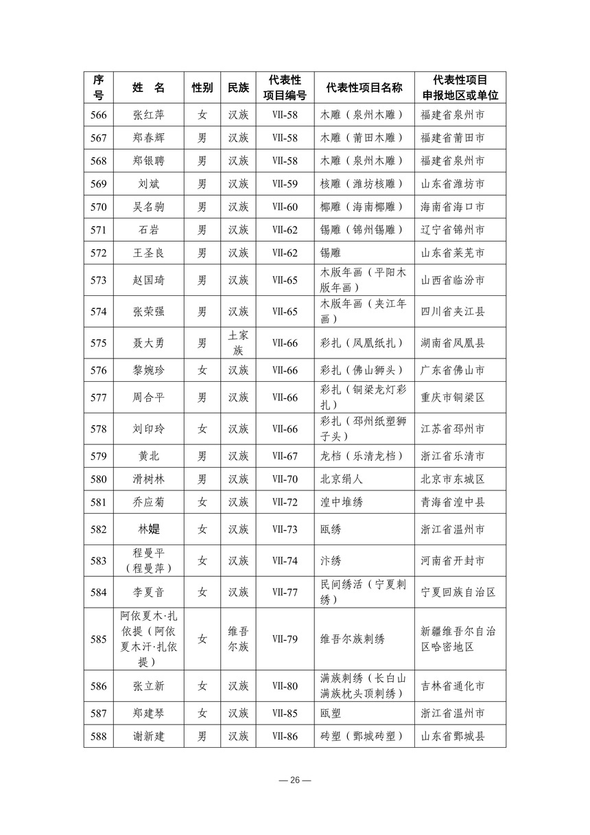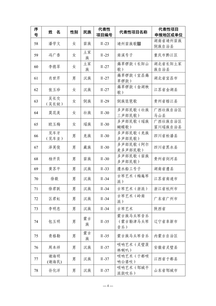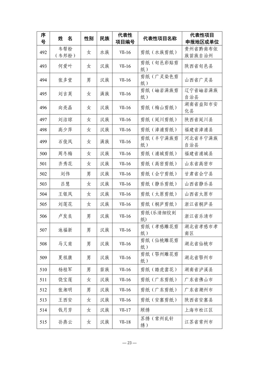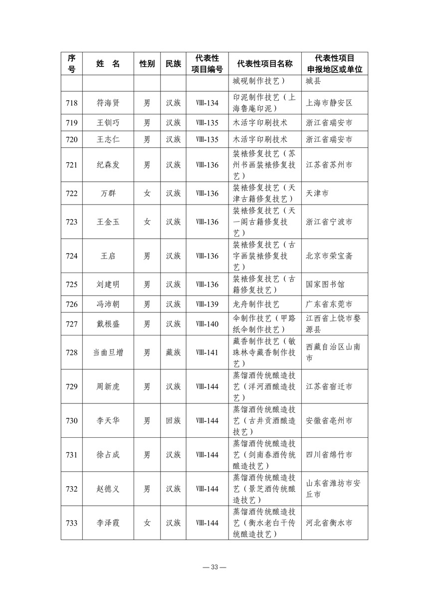 習近平總書記高度重視非物質文化遺產保護傳承,強調要積極培養傳承人,一代一代接下來、傳下去。近年來,各地高度重視非物質文化遺產代表性傳承人隊伍建設,涌現出一大批德藝雙馨、技藝精湛,在非物質文化遺產保護傳承中發揮重要作用的典型代表。根據《中華人民共和國非物質文化遺產法》及《國家級非物質文化遺產代表性傳承人認定與管理辦法》有關規定,為加強非物質文化遺產傳承人隊伍建設,進一步提升非物質文化遺產系統性保護能力水平,保護和傳承好非物質文化遺產,文化和旅游部組織開展第六批國家級非物質文化遺產代表性傳承人認定工作。經推薦申報、材料復核、專家初評、社會公示、評審委員會審議等程序,確定了第六批國家級非物質文化遺產代表性傳承人名單(942人),現予以公布。
