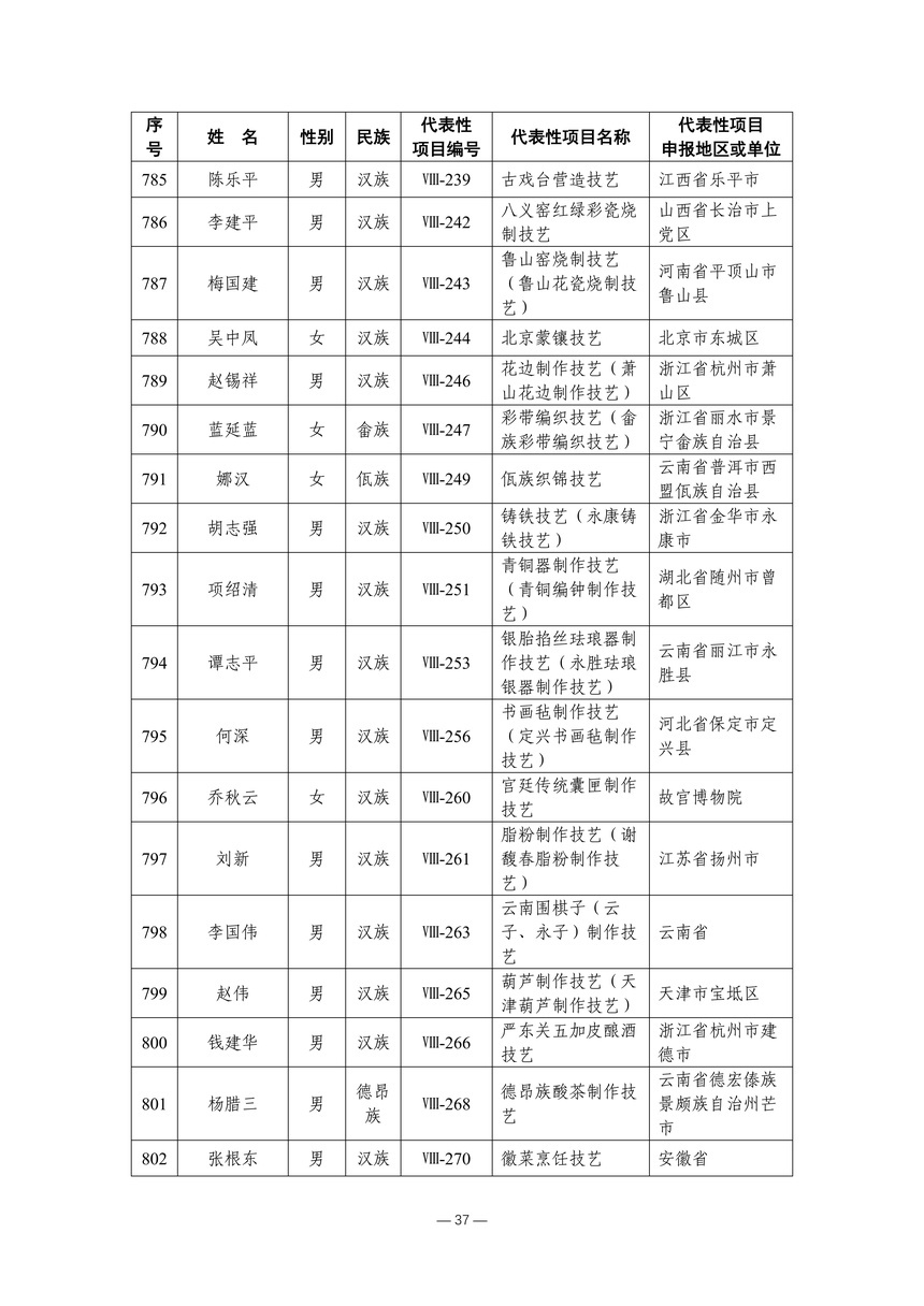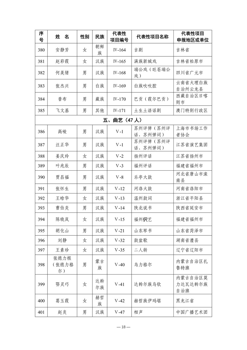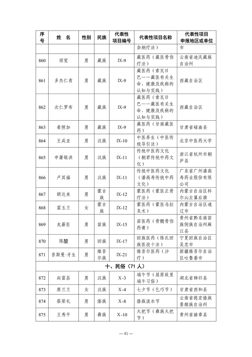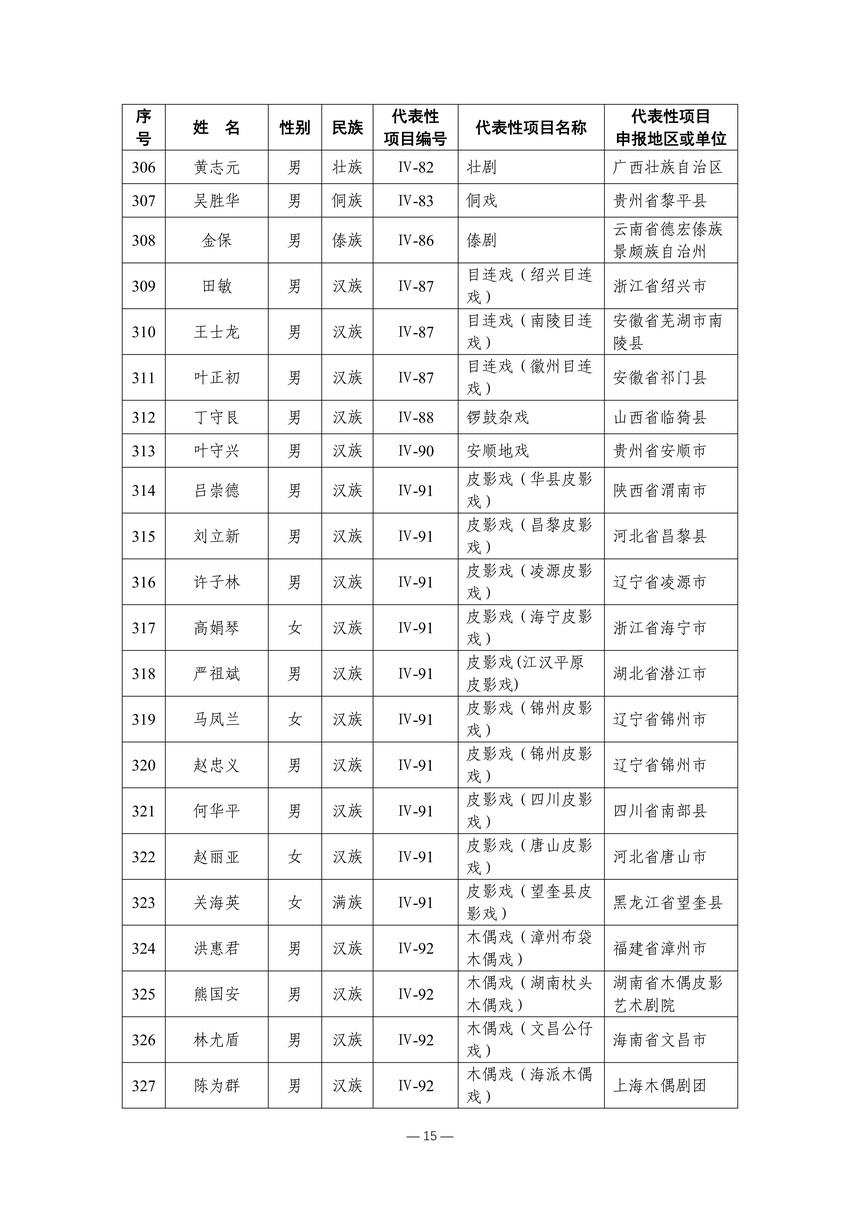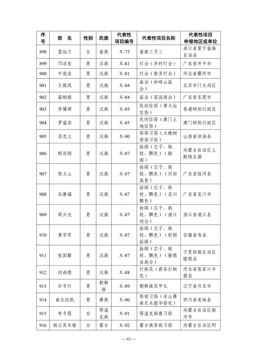 習近平總書記高度重視非物質文化遺產保護傳承,強調要積極培養傳承人,一代一代接下來、傳下去。近年來,各地高度重視非物質文化遺產代表性傳承人隊伍建設,涌現出一大批德藝雙馨、技藝精湛,在非物質文化遺產保護傳承中發揮重要作用的典型代表。根據《中華人民共和國非物質文化遺產法》及《國家級非物質文化遺產代表性傳承人認定與管理辦法》有關規定,為加強非物質文化遺產傳承人隊伍建設,進一步提升非物質文化遺產系統性保護能力水平,保護和傳承好非物質文化遺產,文化和旅游部組織開展第六批國家級非物質文化遺產代表性傳承人認定工作。經推薦申報、材料復核、專家初評、社會公示、評審委員會審議等程序,確定了第六批國家級非物質文化遺產代表性傳承人名單(942人),現予以公布。