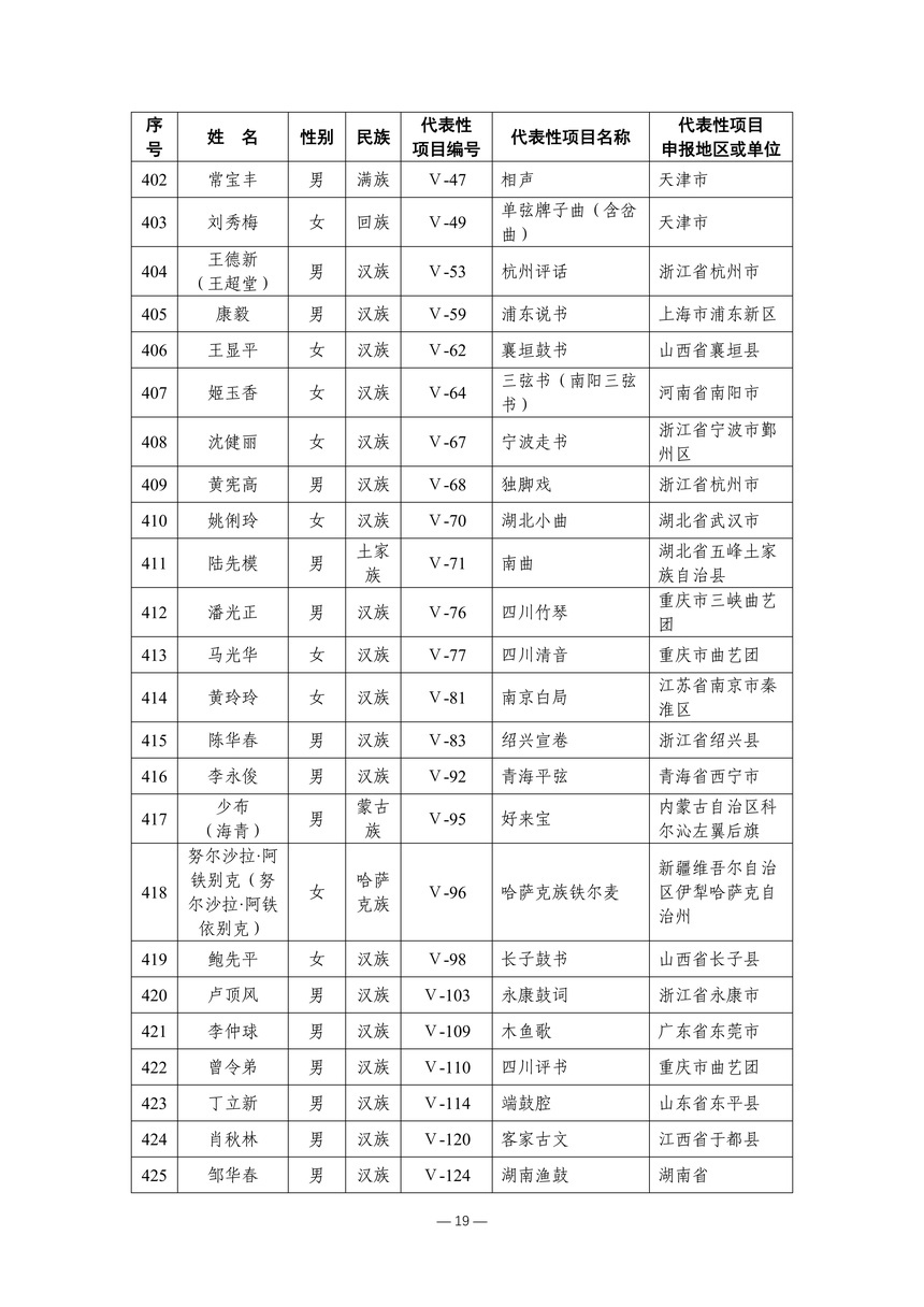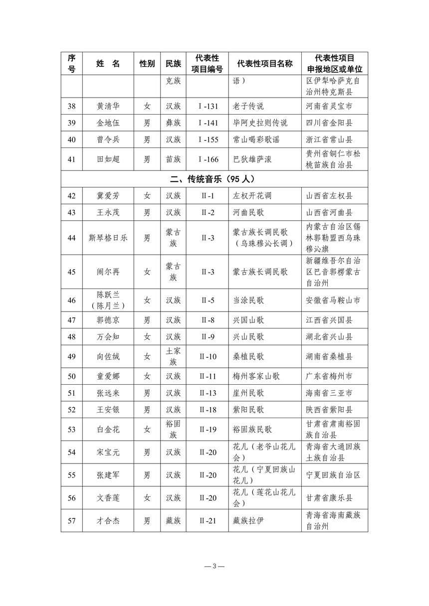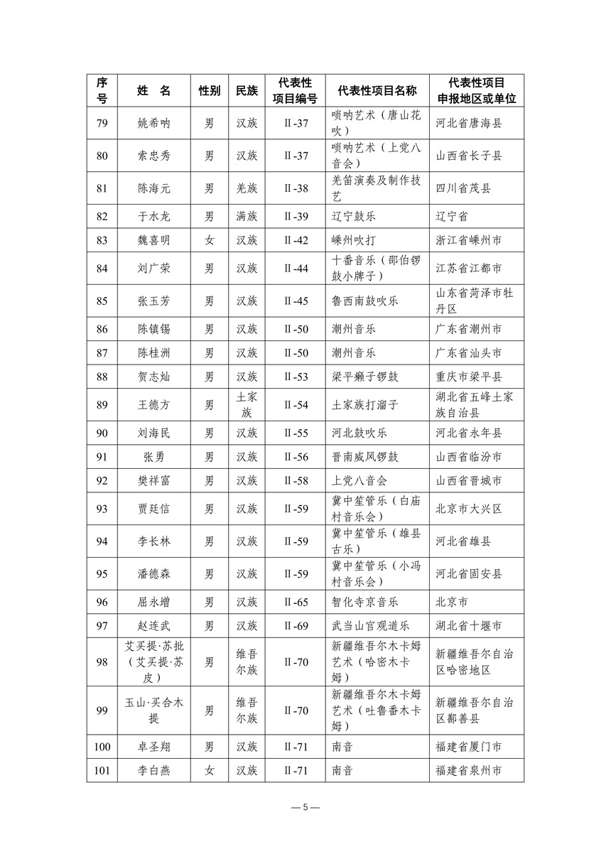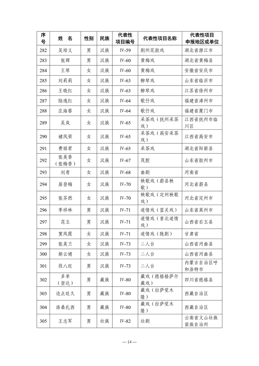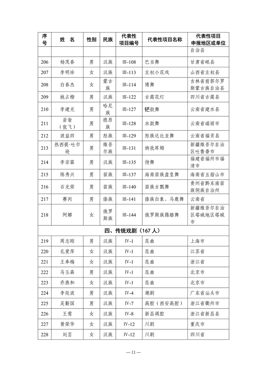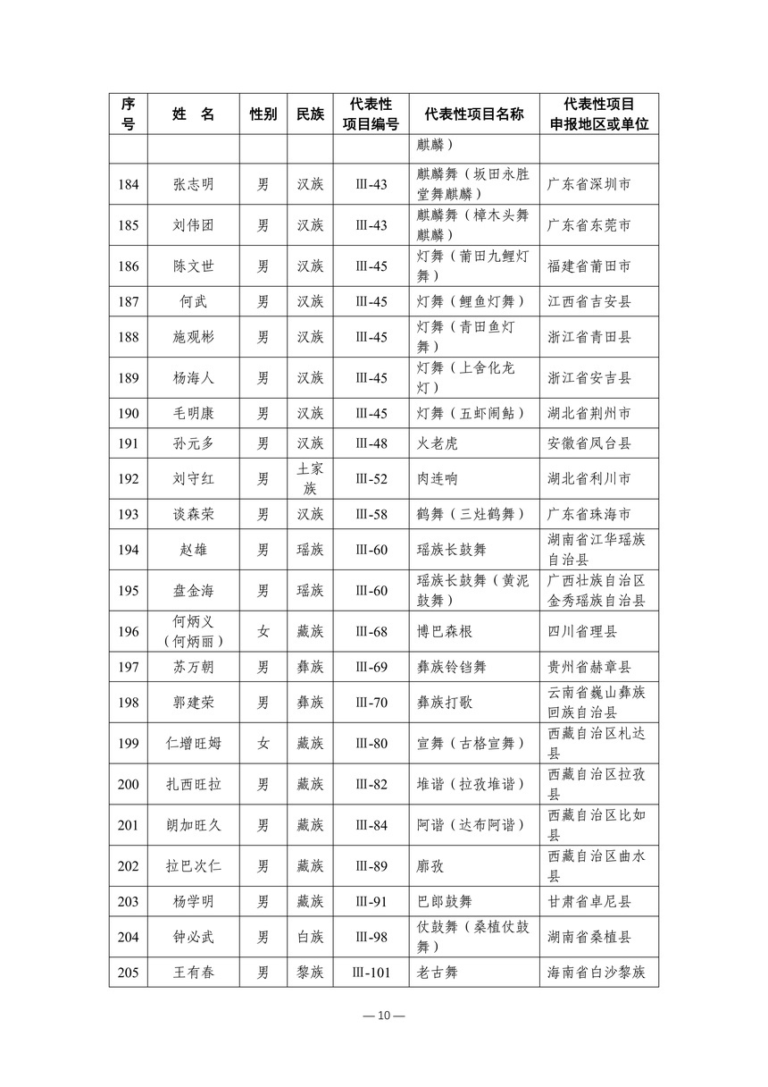 習近平總書記高度重視非物質文化遺產保護傳承,強調要積極培養傳承人,一代一代接下來、傳下去。近年來,各地高度重視非物質文化遺產代表性傳承人隊伍建設,涌現出一大批德藝雙馨、技藝精湛,在非物質文化遺產保護傳承中發揮重要作用的典型代表。根據《中華人民共和國非物質文化遺產法》及《國家級非物質文化遺產代表性傳承人認定與管理辦法》有關規定,為加強非物質文化遺產傳承人隊伍建設,進一步提升非物質文化遺產系統性保護能力水平,保護和傳承好非物質文化遺產,文化和旅游部組織開展第六批國家級非物質文化遺產代表性傳承人認定工作。經推薦申報、材料復核、專家初評、社會公示、評審委員會審議等程序,確定了第六批國家級非物質文化遺產代表性傳承人名單(942人),現予以公布。