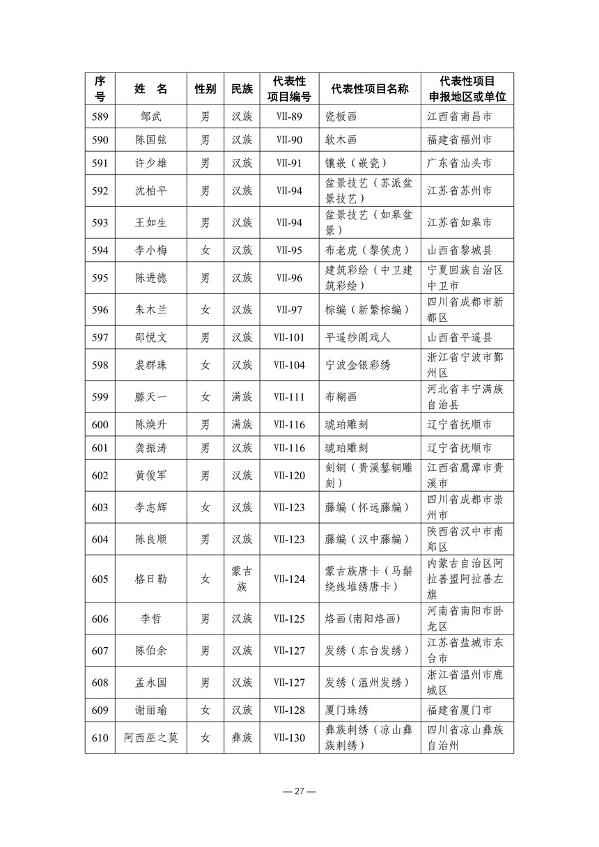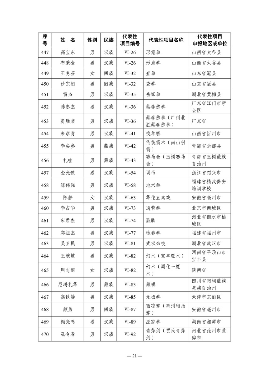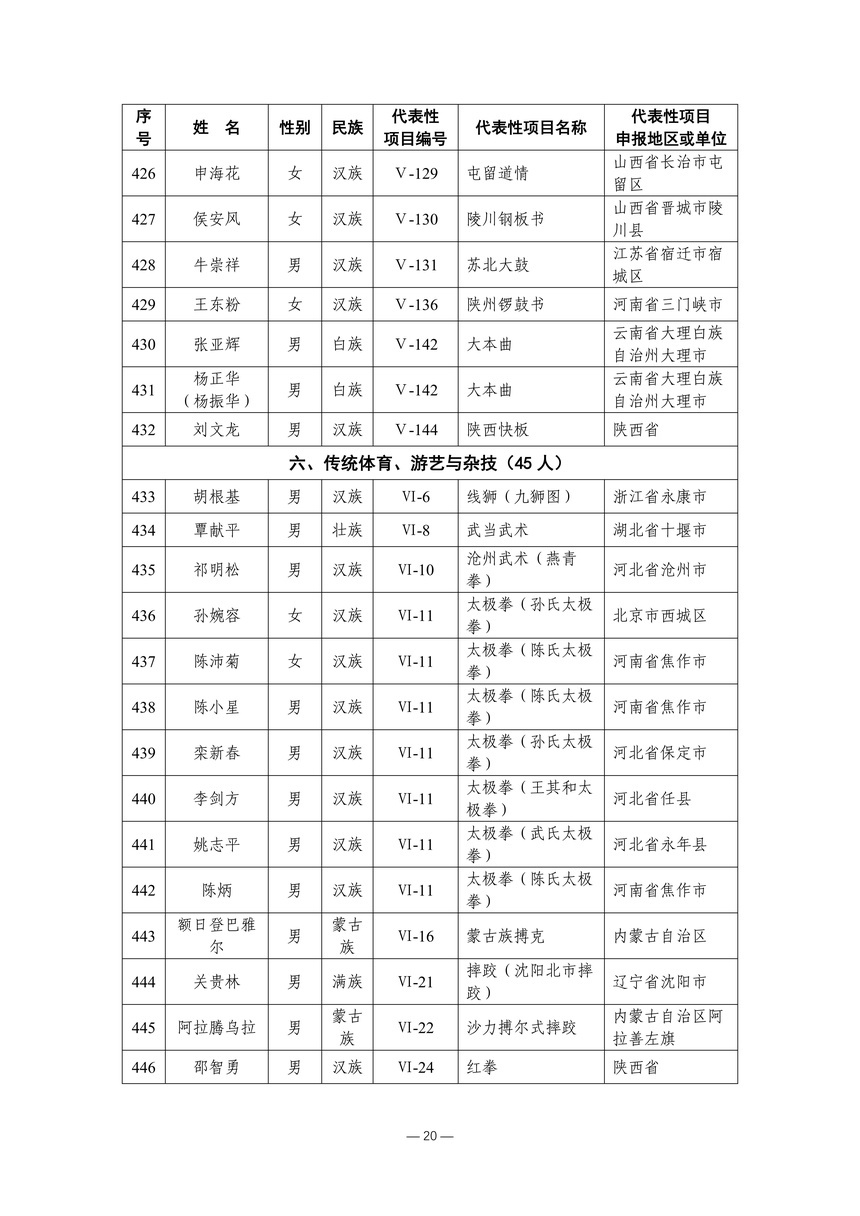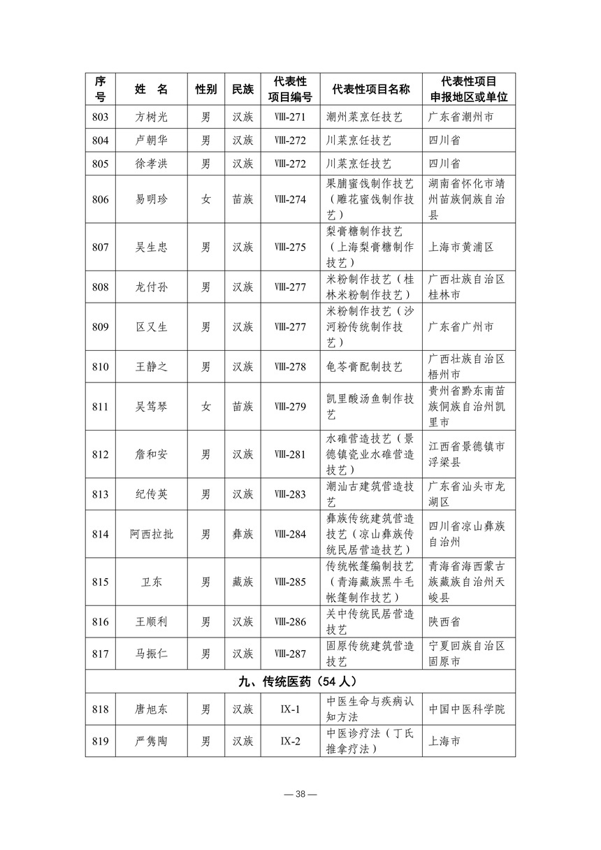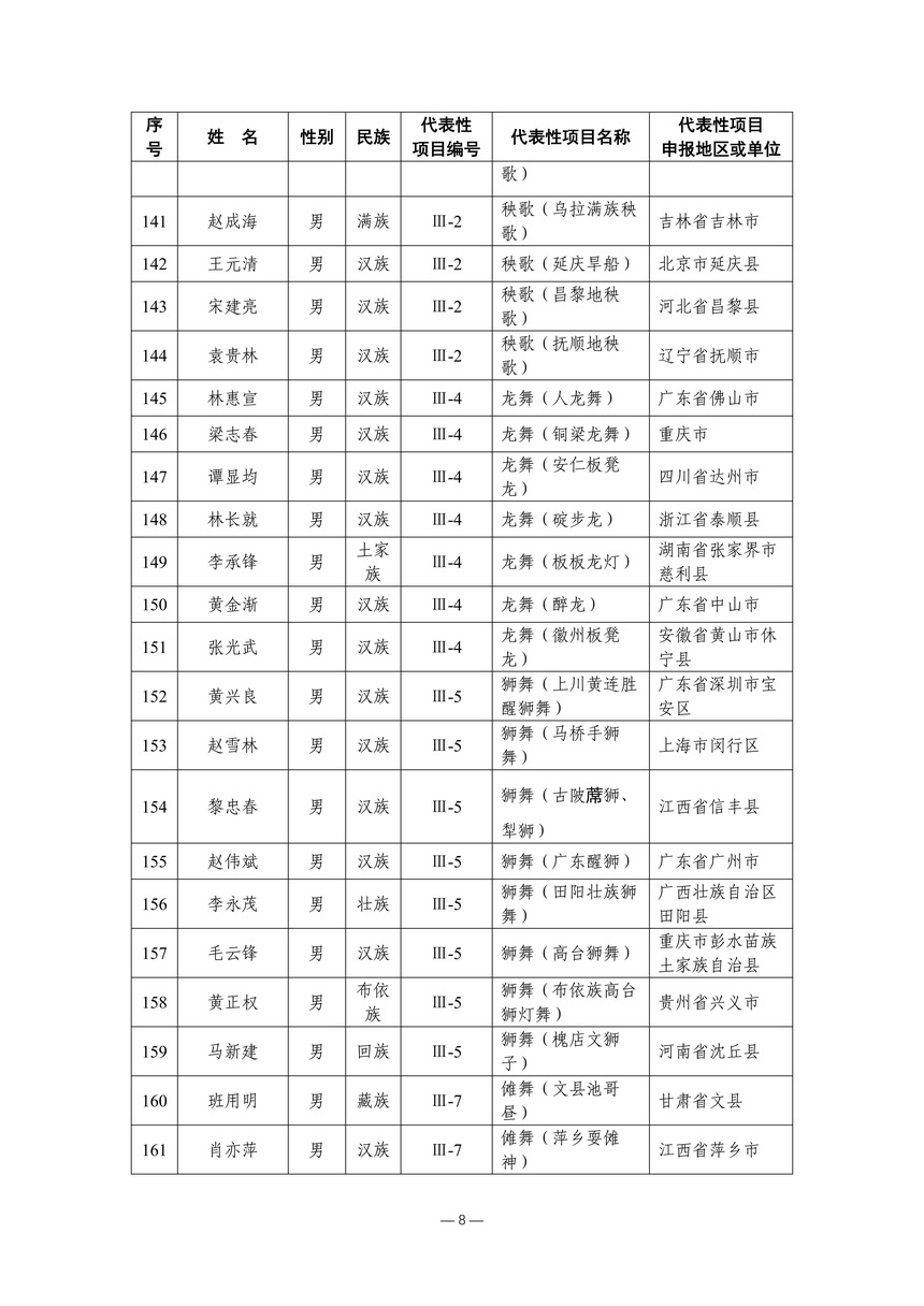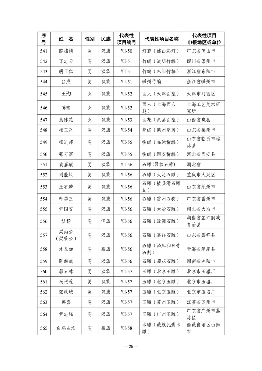 習近平總書記高度重視非物質文化遺產保護傳承,強調要積極培養傳承人,一代一代接下來、傳下去。近年來,各地高度重視非物質文化遺產代表性傳承人隊伍建設,涌現出一大批德藝雙馨、技藝精湛,在非物質文化遺產保護傳承中發揮重要作用的典型代表。根據《中華人民共和國非物質文化遺產法》及《國家級非物質文化遺產代表性傳承人認定與管理辦法》有關規定,為加強非物質文化遺產傳承人隊伍建設,進一步提升非物質文化遺產系統性保護能力水平,保護和傳承好非物質文化遺產,文化和旅游部組織開展第六批國家級非物質文化遺產代表性傳承人認定工作。經推薦申報、材料復核、專家初評、社會公示、評審委員會審議等程序,確定了第六批國家級非物質文化遺產代表性傳承人名單(942人),現予以公布。