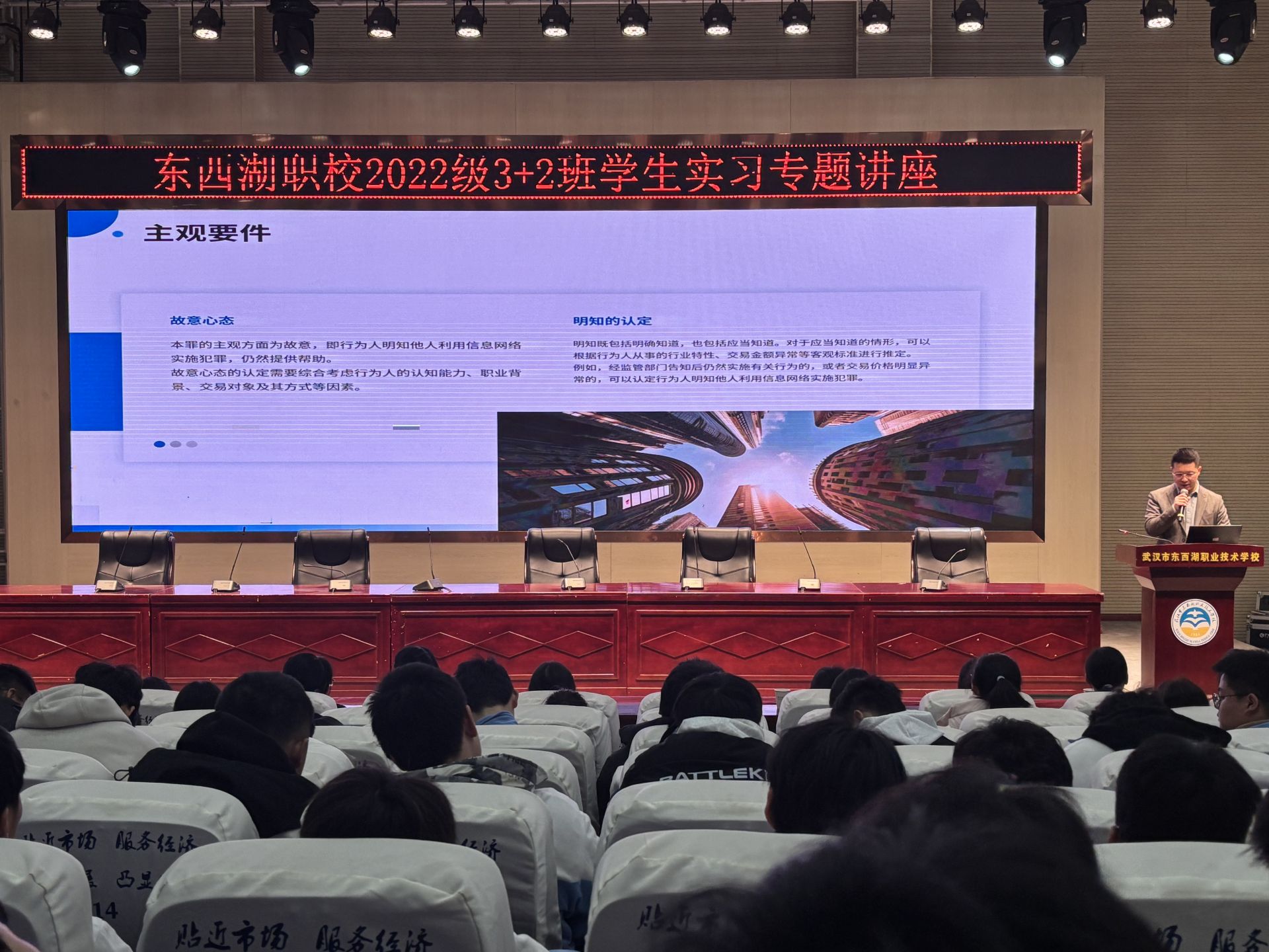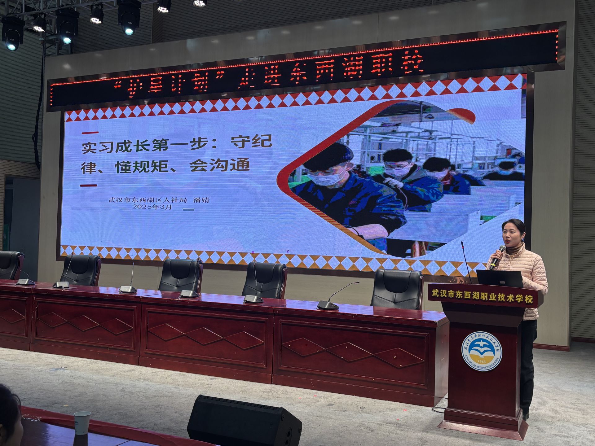 東西湖區人力資源和社會保障局勞動監察員潘婧以《實習成長第一步:懂紀律、守規矩、會溝通》為題,從權益保障、義務履行、安全規范、溝通機制共4個方面入手,通過案例解析與法條解讀相結合的方式,為同學們詳細講述了實習期間應該學會哪些“招”,注意哪些“坑”,如按時到崗不曠工、不違規操作設備、不要代人打卡,讓同學們在接地氣的講解中實現從“懵懂”到“知規”的轉變。