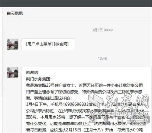 荊楚網(wǎng)(湖北日報網(wǎng))訊(通訊員 賀蕾蕾)近日,荊門市城市水務(wù)集團有限公司(以下簡稱“水務(wù)集團”)公眾號后臺收到了一封長達千字的特別來信。信中,市民曾女士用真摯的語言表達了對水務(wù)集團工作人員的感激之情,尤其是對抄表員陳勝師傅的細心服務(wù)贊不絕口。