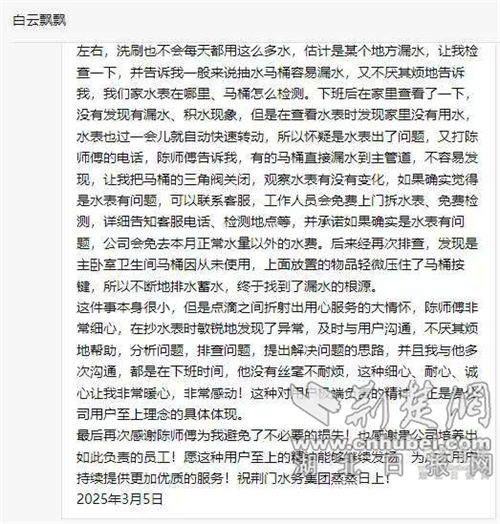 曾女士在信中特別提到,陳師傅非常細心,多次溝通都是在下班時間進行,但他始終沒有絲毫不耐煩。這種細心、耐心、誠心的服務(wù)態(tài)度,讓曾女士深感暖心與感動。她表示,雖然事情看似微小,但點滴之間折射出水務(wù)集團用心服務(wù)的大情懷。