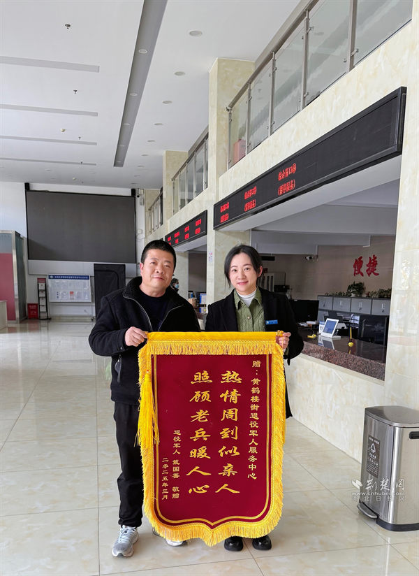 荊楚網(湖北日報網)訊(通訊員 劉麗)3月18日,武昌區黃鶴樓街道便民服務中心迎來了一位特殊的訪客——轄區退役軍人戴老師傅的兒子。他將一面寫有“熱情周到似親人 服務老兵暖人心”的錦旗送到了工作人員楊烔手中,以此感謝她在協助其父親辦理醫療救助過程中展現出的耐心、細致與專業。這面錦旗不僅承載著戴老師傅一家的感激之情,也折射出街道便民服務中心對退役軍人的關懷與溫暖。