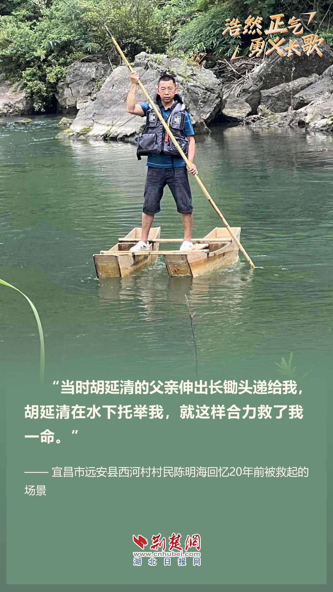“當(dāng)時(shí)胡延清的父親伸出長(zhǎng)鋤頭遞給我,胡延清在水下托舉我,就這樣合力救了我一命?!睍r(shí)隔20年,遠(yuǎn)安縣嫘祖鎮(zhèn)西河村村民陳明海仍清晰記得被救時(shí)的場(chǎng)景。