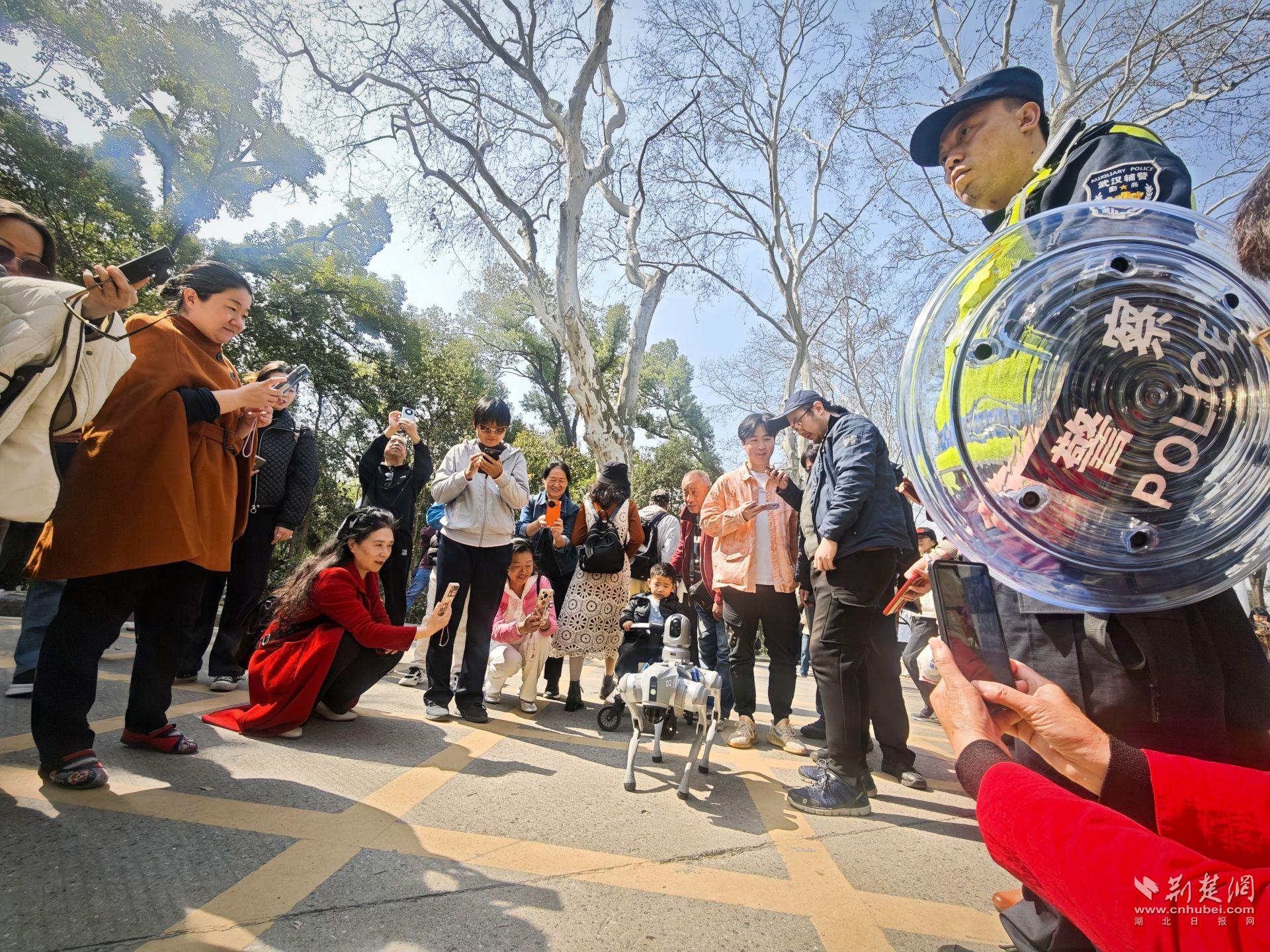 在武昌公安PTU隊員的帶領下,“小珈”同警犬“Falcon”一起組成巡邏編隊,在櫻花大道等核心區域開展巡邏。爬臺階、監測周邊環境,實時識別異常并語音播報安全提示?!皺鸦m美,安全第一,請勿擁擠”“拍照時請注意腳下臺階”,游客紛紛跟隨,不少小朋友大膽上前拍照留影。