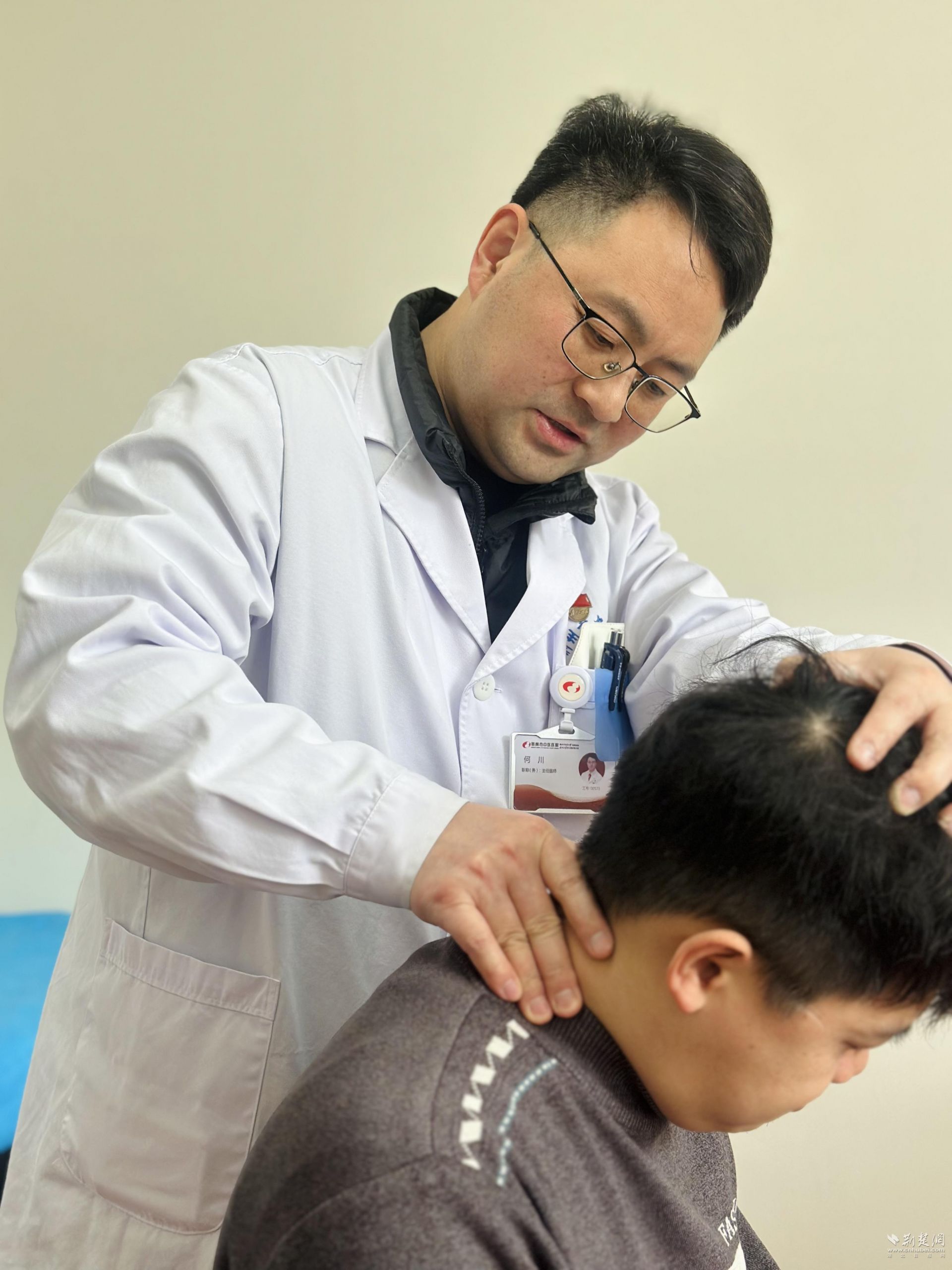診室里飄著中藥草香,何川的雙手正進行著另一種“手術”。只見他雙掌托住患者下頜與枕部,拇指精準感知寰樞關節的細微錯位,突然發力旋扳,“咔嗒”輕響中完成復位。患者驚呼“還沒覺著疼,頸部就松快了”。