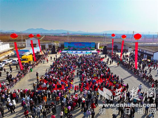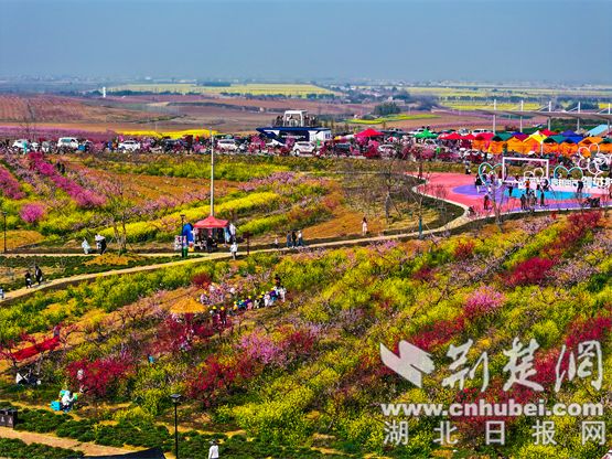一大早,開幕式舞臺前便坐滿了慕名而來的游客。由荊門市群藝館和當(dāng)?shù)匚乃噽酆谜邘淼摹渡洗荷健贰跺\繡前程》《弓映桃花 箭舞春風(fēng)》等節(jié)目為游客呈現(xiàn)了一場視聽盛宴。與主舞臺附近的熱鬧場景相呼應(yīng),舞臺四周的花海里同樣人流如織。從天空俯瞰,漫山遍野的紅色花海與遠(yuǎn)處金黃的油菜花、綠油油的小麥交相輝映,將大地勾勒成一幅層次分明、充滿詩意的畫卷。來自武漢的游客譚虹說:“早就聽說屈家?guī)X的桃花很美,我今天特意趕過來看看,果然讓人眼前一亮。看著層層疊疊的桃花,心情十分舒暢。”