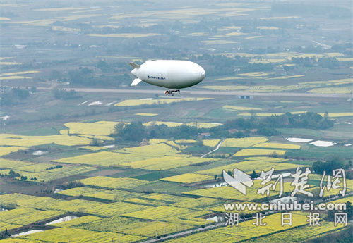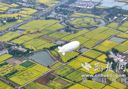 “祥云”AS700載人飛艇首次亮相江漢平原油菜花海。通訊員 供圖