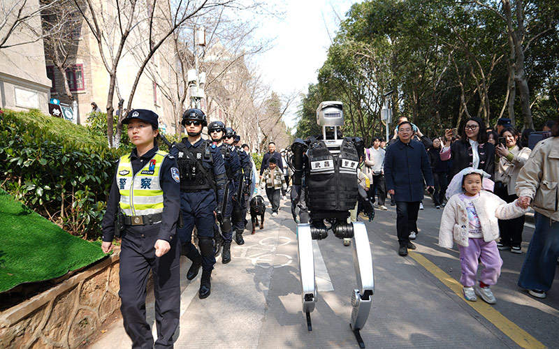 3月16日下午,在武漢大學櫻花大道盛開的櫻花樹下,一臺身著黑色馬甲的白色人形機器人穿梭在人群中,吸引了游客的目光。